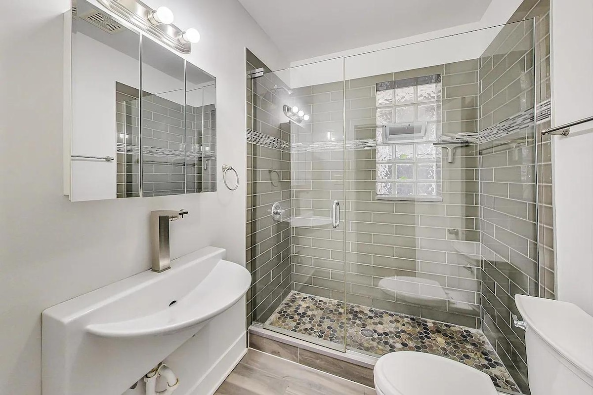 レトロモダンなバンガローで、お友達と一緒に最大4名様までご宿泊いただける、スタイリッシュな街を体験してください。広々とした寝室2部屋には、それぞれキングサイズのベッドと豪華なリネンが備わっています。プロパンの焚き火台と、フェンスで囲まれた子犬に優しい裏庭もあります。セントラルHVAC、高速Wi-Fi、仕事専用スペースをお楽しみください。パックンプレイベビーベッドは無料でご利用いただけます。オークパークのすぐ南に位置し、ミッドウェイ空港から15分、ダウンタウンから20分の便利なロケーションです。ガレージに無料で駐車するか、数ブロック先の電車に乗りましょう。
