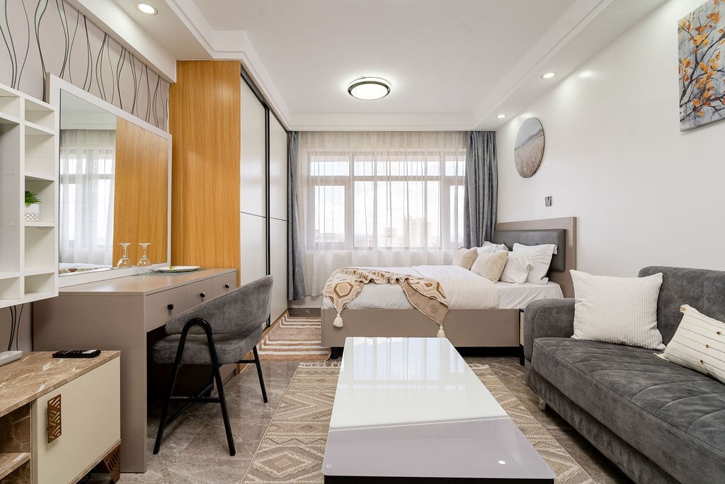 このエレガントで上品に家具が取り付けられたアパートは4階にあり、周辺の素晴らしい景色を眺めることができます。 24時間セキュリティ付きのゲート付きコミュニティは、ナイロビの金融地区にあり、ダウンタウン、ケニヤッタ&ナイロビ病院、AAR、ナイロビクラブ、国立図書館、レストラン、銀行、ショッピングモールへ簡単にアクセスできます。 イスラエル大使館とフェアビューホテルの近くにあります。 出張や休暇の滞在に最適です。 私たちのお部屋は消毒・除菌されています。
