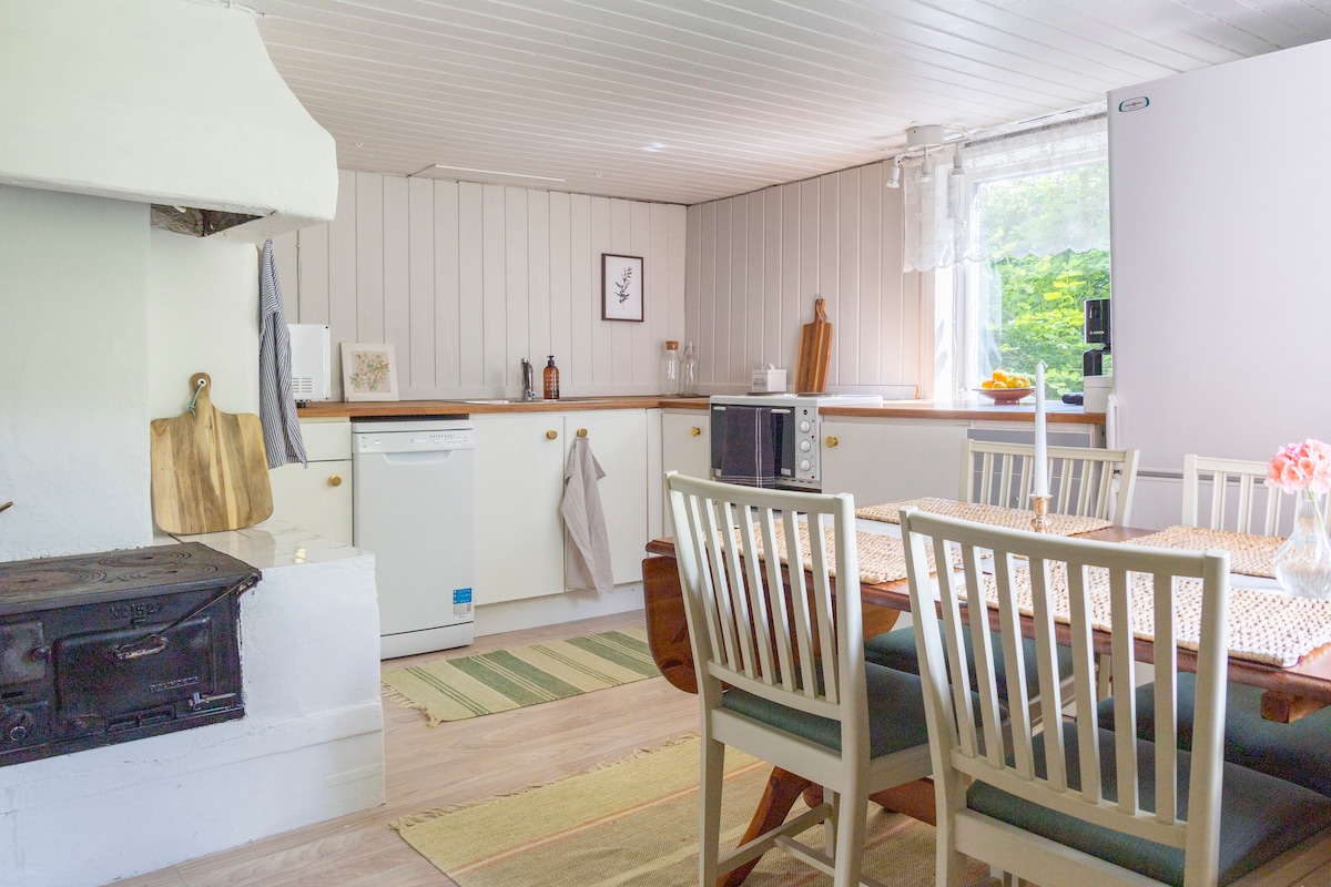 Charming 130-year-old cottage (90 m²) with a modern yet cosy feel. Two renowned spas (Yasuragi & Skepparholmen) within walking distance. Bottom floor: kitchen and dining area with classic wood stove, living room and bathroom. Your own garden and spacious wooden deck—perfect for sunbathing or BBQs. Set in a beautiful area with a crystal-clear lake for bathing just 200 m away, with a nature reserve surrounding it. Sea dock ~700 m. 30 minutes to Stockholm by Waxholm boat, bus or car.