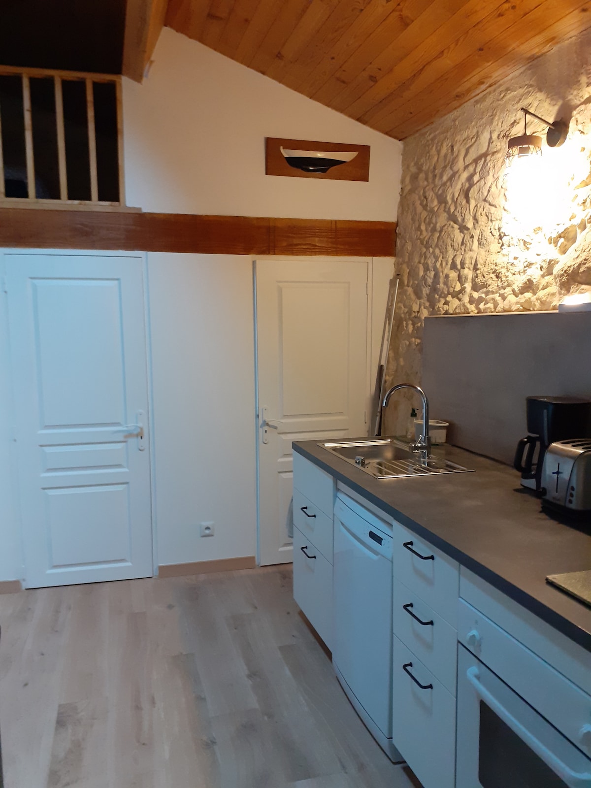 素朴な木製の高い天井のある広々とした部屋(90m2)。2階とバスルームには天井梁が見えます。 7mの高さの天窓から2階へアクセスでき、工場スタイルが非常にユニークです。 このコテージは、かつての大工の工房で、多くの魅力を備えた改装が施されています。ロマーニュ・ジェルゾワの静かで絵のように美しい村にあり、設備が整い、エアコンも完備されています。