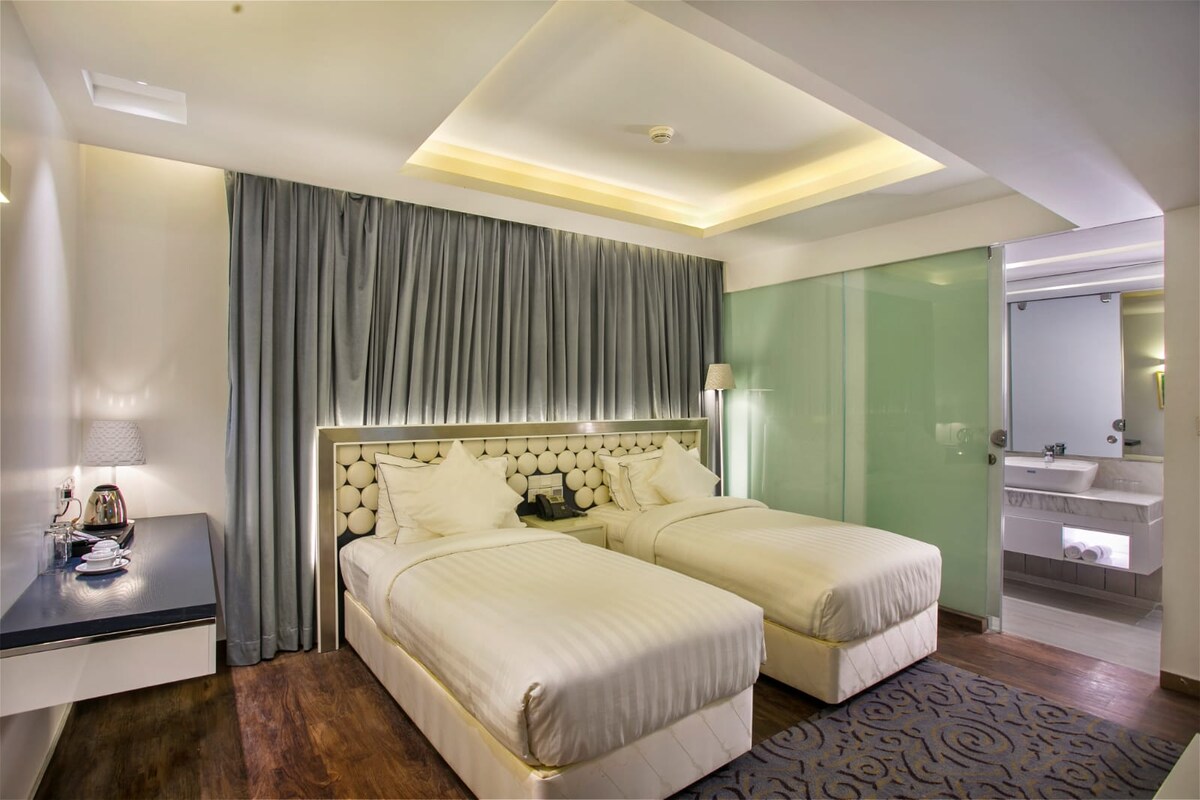 空港近くのダブルルームと専用バスルーム