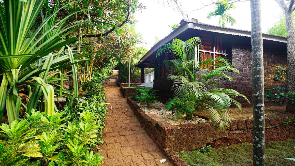 ゴカルナのクドレビーチから徒歩圏内にある静かなヨガリトリート、ナマステ・ヨガ・ファームの穏やかなクラシックコテージに滞在しましょう。天然のラテライト石の壁で建てられたこのコテージは、涼しく静かで、熱帯植物の庭に面した専用テラスがあります。自然、落ち着き、シンプルな快適さを求めるカップルや一人旅の方にぴったりです。専用バスルーム、扇風機、お茶・コーヒーの設備、座るエリア、Wi-Fiが備わっており、リラックスした隠れ家的な雰囲気をお楽しみいただけます。