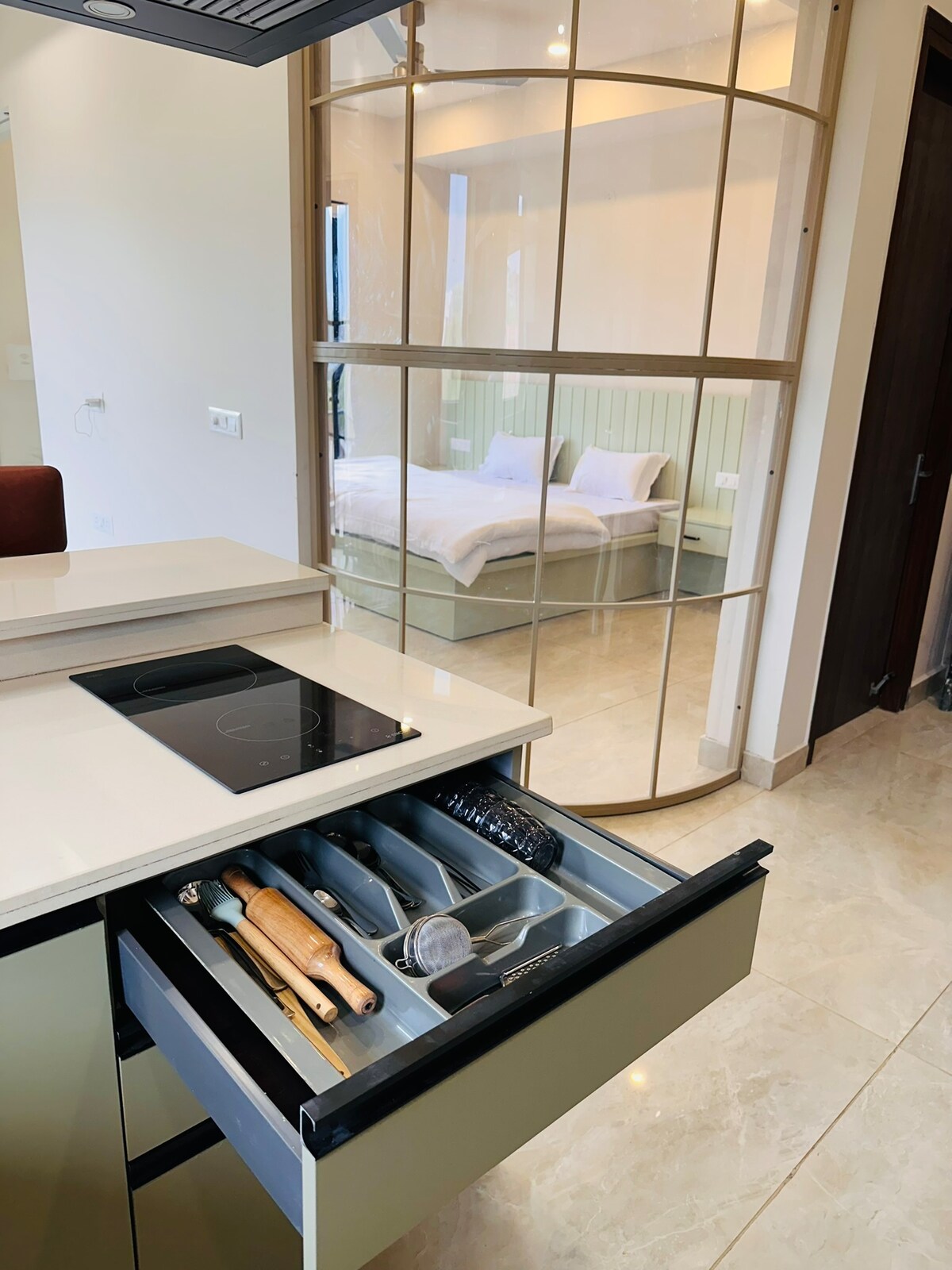 デラドゥンにあるエレガントなフルサービスのワンルームマンション・アパートをご覧ください!快適な寝室と居間、無料Wi-Fi、エアコン、テレビ、専用バスルームが備わっています。天井が高く、大きな窓、2つの専用バルコニーがあるお部屋の専用ワークステーションで快適に働けます。設備の整ったキッチン、応急処置キット、消火器、無料駐車場、スムーズなセルフチェックイン、ボードゲーム、ヘアドライヤー、アイロンなどの必需品をご利用いただけます。