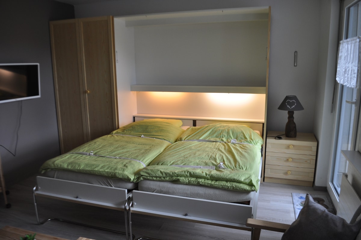 1階にある39㎡の2部屋のアパートで、南向きの位置にあり、有名な山々の素晴らしい景色を眺めることができます(アイガービュー! )。 モダンで居心地の良い家具:ケーブルテレビとラジオを備えたリビング/ダイニングルーム。 テラスを出て、ベッド2台付きの部屋1部屋、キッチン、シャワー/トイレ