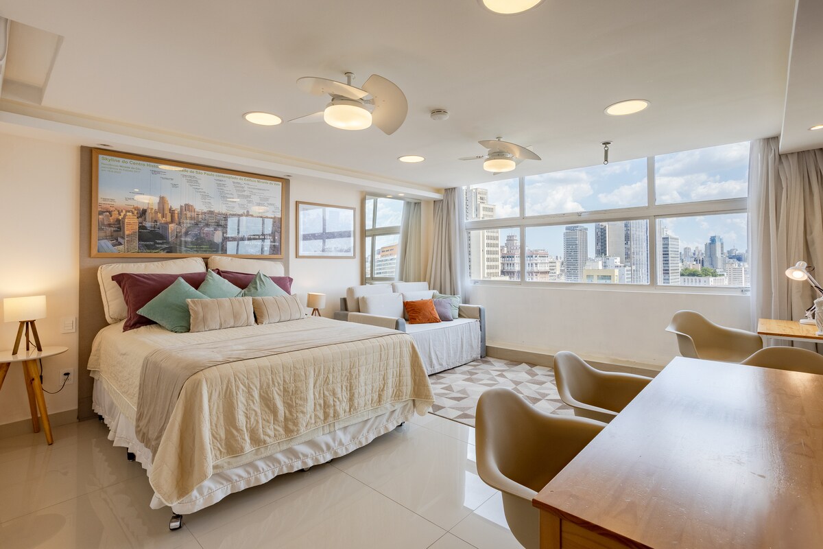 スタジオは、市内で最も高いビルの31階にあり、モダンで居心地の良いデザインで、街の素晴らしい景色を眺めることができます。窓からは、アニャンガバウ渓谷、歴史地区、アベニューのアンテナを眺めることができます。パウリスタ通りのアンテナ、サンパウロで最も美しい景色の1つです。 サンパスカイのある建物で、中心部の主要なアトラクションまで徒歩で行くことができます。 エアコン、アプリ付き55インチテレビ、基本的な調理器具、コンロ(1口)、電子レンジ、ミニバーを備えたキッチンがあります。