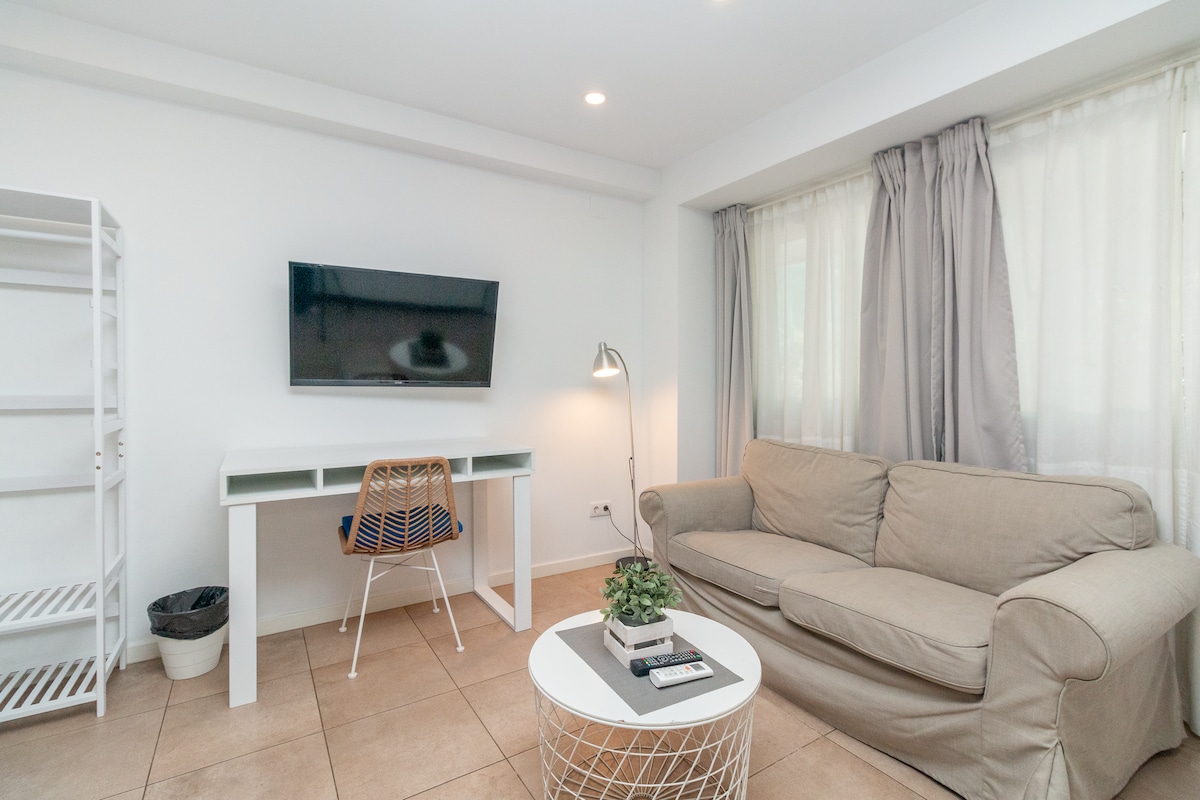 快適なシーティングエリアにダブルベッドとソファベッドを備えた、最大4名様用の明るい屋外アパート。 コンロ、電子レンジ、冷蔵庫、ネスプレッソマシンを完備したキッチン。 ヘアドライヤー、タオル、衛生用品を備えたバスルーム。 エアコンと高速インターネットが備わっています。 壮大なパティオがあり、バレンシアの静かなエリアにある海や芸術市の近くにあります。