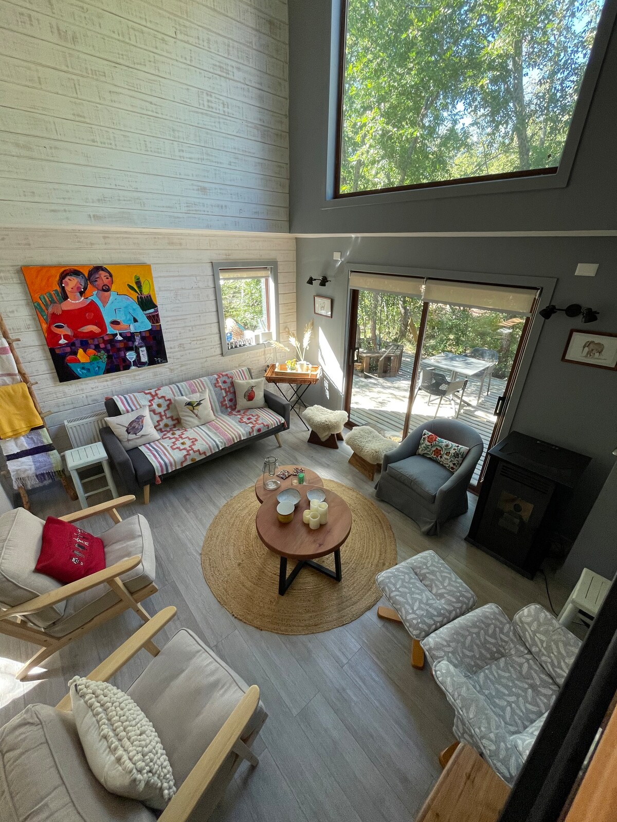Acogedora cabaña en el mejor sector de Shangrila, dentro del Refugio Las Araucarias, con vista panorámica al valle. A 800 metros del camino principal. Refugio con 3 cabañas y quincho para arriendo. A menos de 10 min de las Termas de Chillán ♨️ Incluye piscina con piedra de laja 🏊♀️ (consulte temporada). 2 habitaciones con cama matrimonial (2 plazas) + una cama bajita (casi en el piso) para una 5ta persona.