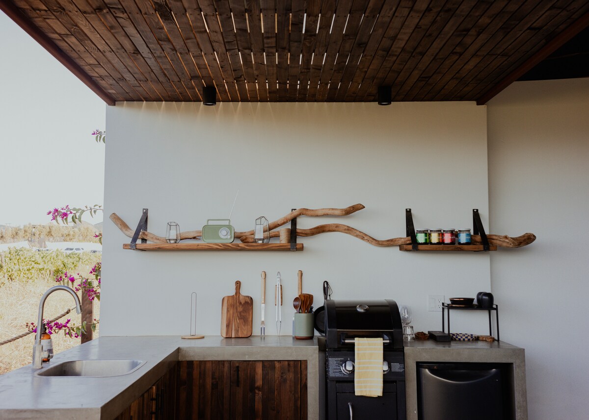 Bask in the vineyard, mountain, & valley views while capturing the sunrise in the atrium & sunset on the terrace. This home was meant for entertaining with both in & outdoor spaces for up to 6 people maximum comfortably. Located in the heart of the Valle with easy access off of Route 3. We are within 5-15 minutes from several wineries and amazing Michelin starred and Latin America Top 50 restaurants. The wine museum is a short 5 minutes away. Arena Valle de Guadalupe is 20 minutes away.