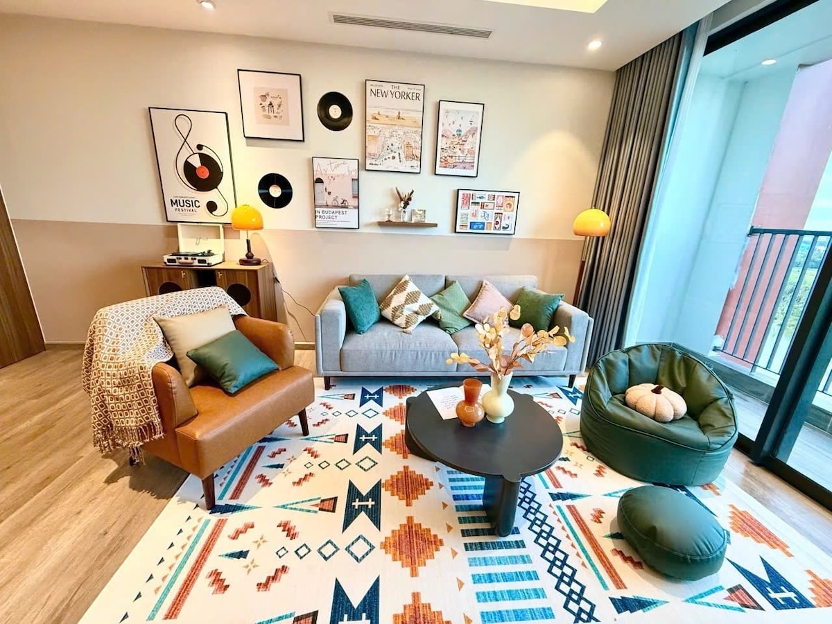 スワンレイクのそば、エコパーク中心部・R2の3階にあるファームハウス風デュプレックスへようこそ!理想的な立地で徒歩移動も便利。1ベッドルーム+ソファベッド、浴槽付きのバスルームを含む2バスルーム。4人家族やカップルに最適。設備充実:80インチプロジェクター、43インチTV、Harman Kardonスピーカー、キッチン、電子レンジ、洗濯機、緑のバルコニー、Wi-Fi、作業スペース。