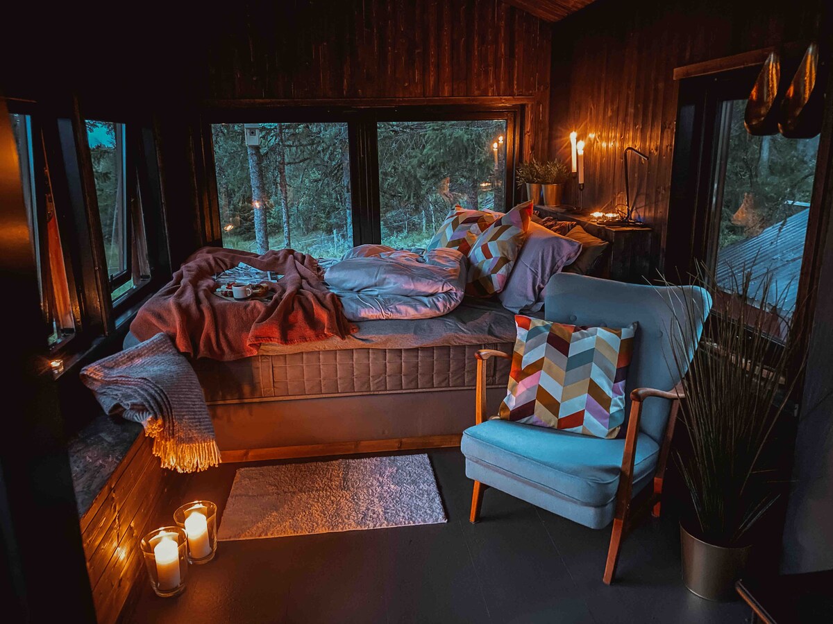 仕事とストレスを解消する場所です。一人で森に泊まる機会があります。 大丈夫で4人が眠れますが、2人に最適です。乾燥した素敵な木材を無料でご利用いただけます。駐車場から200メートルです。 狩猟や魚を食べることができます。 -屋外キッチンには、水道水と寝室のキャビンに夏用水があります。 -屋外シャワー(夏の水)は、無制限の水がないため、短時間のシャワーにも適しています。 - 50 GBのモバイルWi - Fiを無制限に使用することはできません。