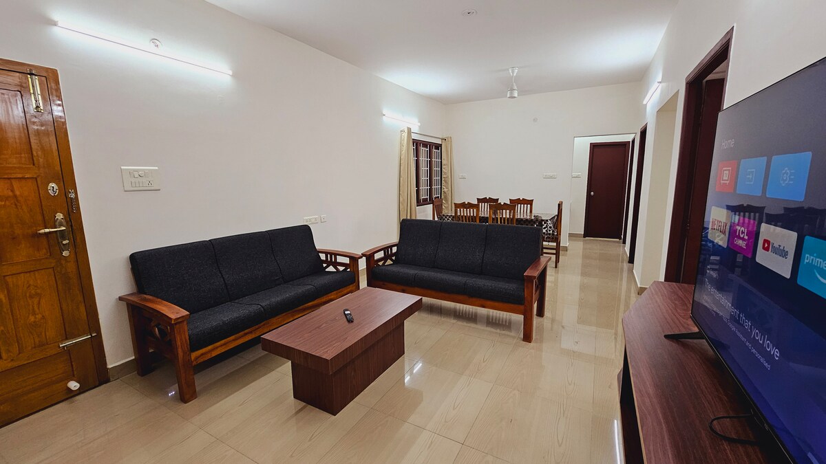 - 寝室2室(クローゼットと専用バスルーム付き) - リビングルームと2つの寝室にエアコン - 高速Wi-Fiとスマートテレビ - 料理用ガスコンロ - IHコンロ、ミキシー、電子レンジ、冷蔵庫、ケトル、必需品が備わったモジュラーキッチン - リビングルームにあるくつろげる木製のブランコ - 1日おきの清掃 - 洗濯をしたい場合に使える洗濯機 - オンコールドライバーサービス - ヴェラチェリー100フィートロードまで徒歩2分 -フェニックスマーケットシティまで徒歩10分 - IITチェンナイ(ベラチェリーゲート)とグルナナックカレッジまで徒歩10分