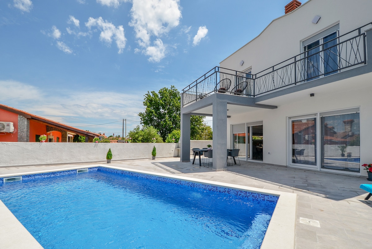 Villa Natali is a newly built holiday home in a quiet village of Kavran. The villa has 2 bedrooms, 3 bathrooms, a fully equipped kitchen and a living room with a total area of 130 m2. The outdoor area includes a 24 m² swimming pool, a sunbathing area with sun loungers, a covered terrace with garden furniture and a barbecue. Both bedrooms have access to the first floor terrace. The villa is fully air conditioned, all rooms are covered with wifi signal and there are 2 outdoor parking spaces.