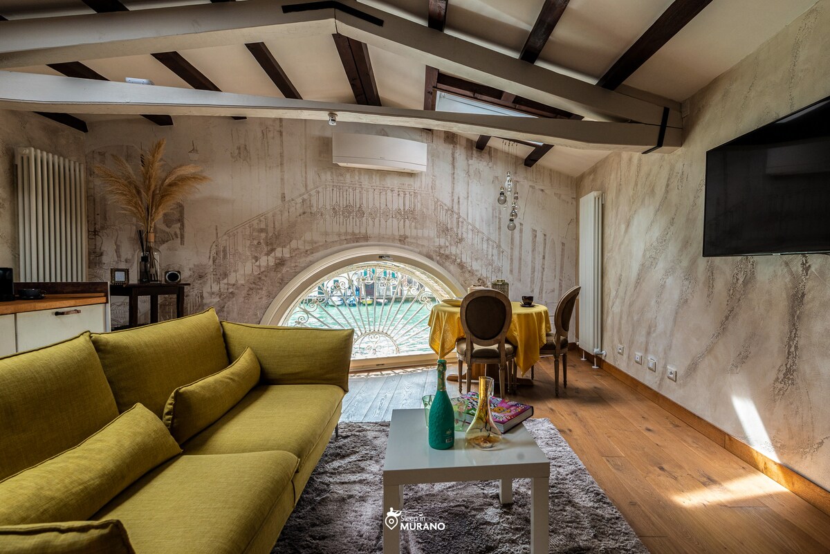 MURANO Suites - RUBINO, 70sqm of exclusivity. On the first floor, overlooking the Grand Canal of Murano with a striking view from a royal arched window that conveys the feeling of sleeping in the water. Great brightness given by 4 dormers installed in the exposed wooden roof. In the center, a two-sided fireplace divides the sleeping area from the living area, a particular situation that is probably unique in its context.