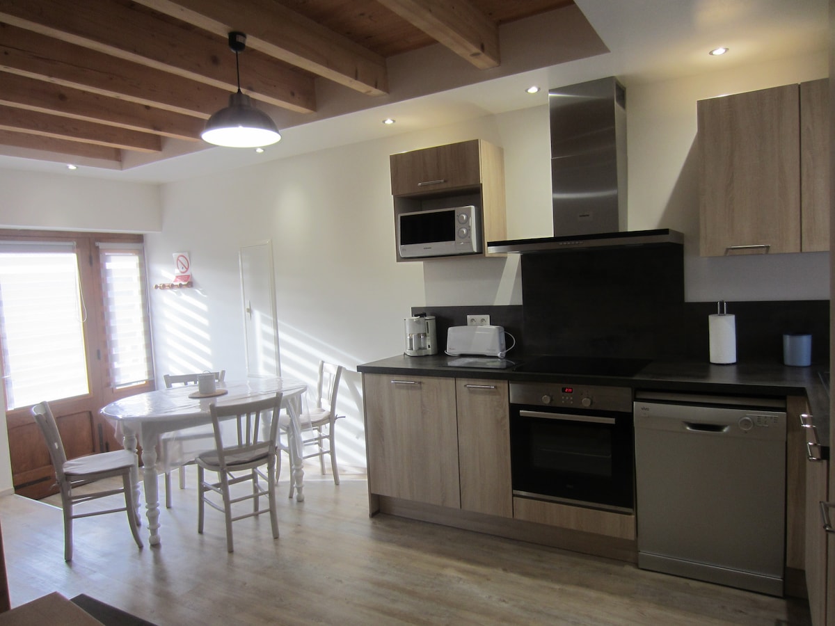 田舎の環境にある、修復された古い納屋の中の60平方メートルの美しいT3を貸し出しています。所有者の住居に近いです。 アパートは、1階にダイニングエリアを備えたキッチン、2階にソファーベッドを備えたリビングルーム、寝室2部屋、シャワー付きバスルーム、独立したトイレで構成されています。外には、テーブルとガーデンチェアが備えられた木製の専用テラスと、お車用の駐車スペースがあります。