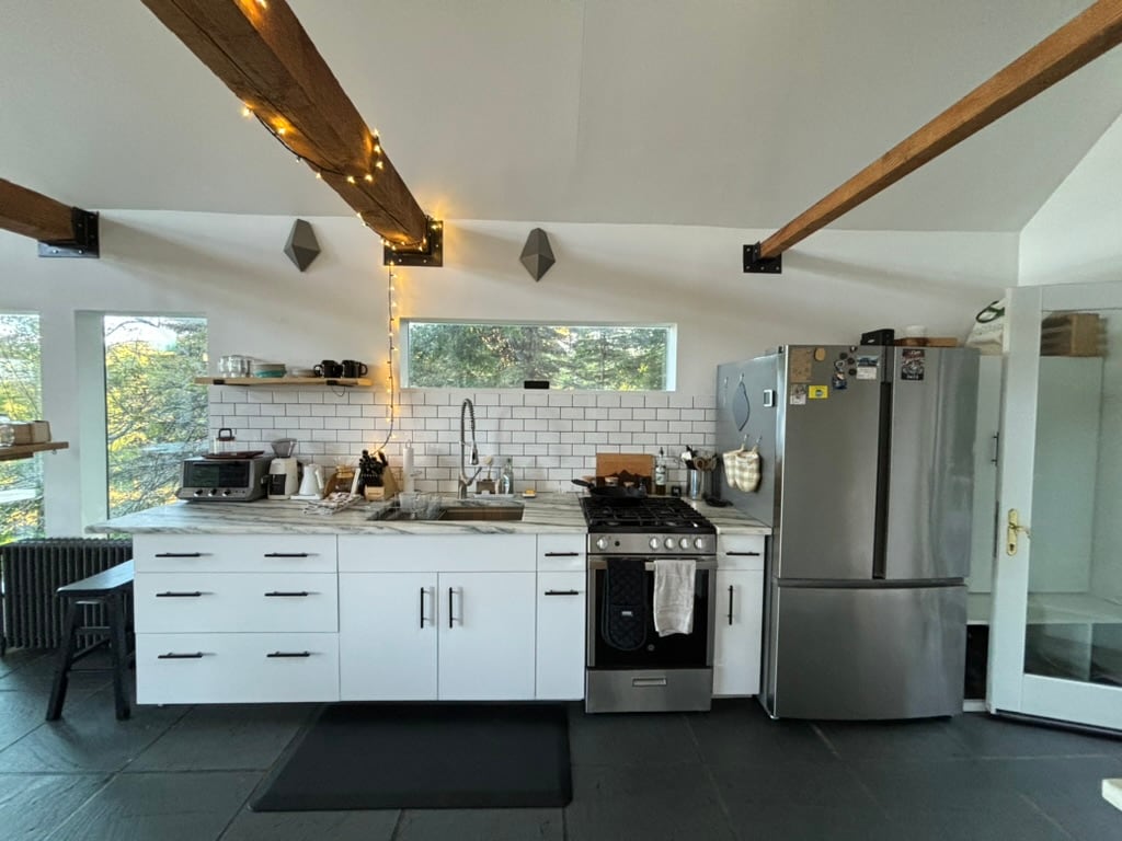 This boutique tiny home is situated in the picturesque Upper Valley of Vermont. The nearly 50 acres of private land is equal parts woods and water. You will wake to the mooing of dairy cows. Have your coffee on the porch while watching birds dive for their breakfast on the pond. Inside you will find every modern amenity. A fully appointed chef's kitchen. A living area filled with comfy furnishings and a cozy fireplace. Upstairs is a queen bedroom with an ensuite double showered bathroom. Heaven!
