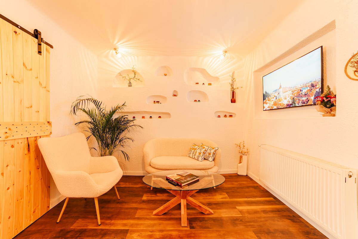 Our apartment is just steps from Piata Mare (Grand Square) in Sibiu. Located in a 200-year-old historic building, it features a cozy bedroom, living area with smart TV (Netflix), fast Wi-Fi, and a fully equipped kitchen with coffee maker, stove, and washing machine. Central heating keeps things warm in winter, and A/C is available during summer. A small private terrace adds extra charm—perfect for relaxing after a day of exploring the city.