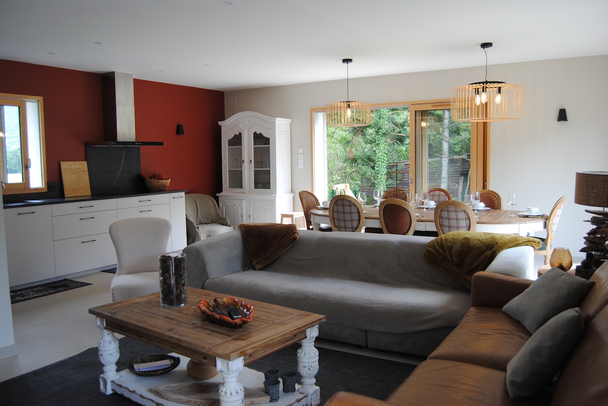 ネスト・ドール川沿いのロンゲ・ド・シャルム・コミューンにある、2000m²の森林公園に囲まれた360m²の壮大なピレネー様式の家。 デザイン性の高い快適なインテリアの家で、15名様に最適です。6つの寝室、5つのバスルーム、2つのリビングルーム(暖炉とゲームスペース)、設備の整ったキッチン、バーベキューグリル付きの大きなテラス、専用駐車場など、夏でも冬でも家族や友人との忘れられない滞在に必要なものがすべて揃っています。