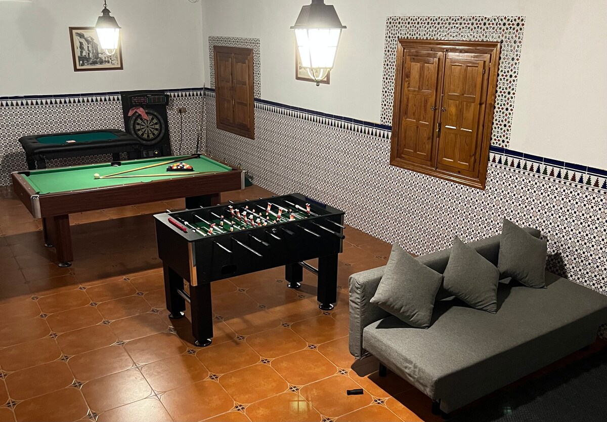 Amplio cortijo rural recién reformado, con espacios luminosos y totalmente equipados. Ideal para reuniones familiares o grupos grandes. Todas las habitaciones con A/C. Gran sala de juegos con billar, futbolín, arcade, póker y dardos. Piscina privada con cascada, jacuzzi, zona playa, césped, barbacoa, baños, frigorífico y hamacas. Parque infantil. Capacidad hasta 20 personas, Mascotas 15 kg. ¡WiFi en casa y piscina!