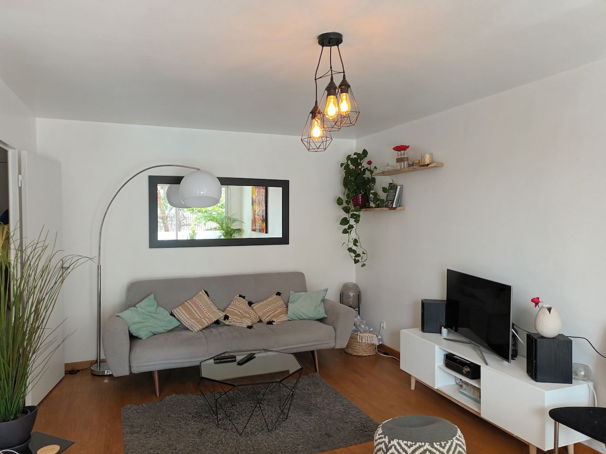 A 2 pas de Paris, bel appartement lumineux tout confort dans un quartier calme. Vous pouvez y séjourner jusqu'à 4 personnes. Il se compose d'une chambre ( literie de qualité), d'un salon (canapé convertible grand confort), d'une cuisine équipée. La salle de bains avec WC dispose d'un lave-linge et un grand dressing. Accès immédiat à Paris via RER, métro, bus, tramways et à vélos ( 2 en prêt sur demande). Tous commerces en proximité immédiate. Stationnement libre et borne de chargement.