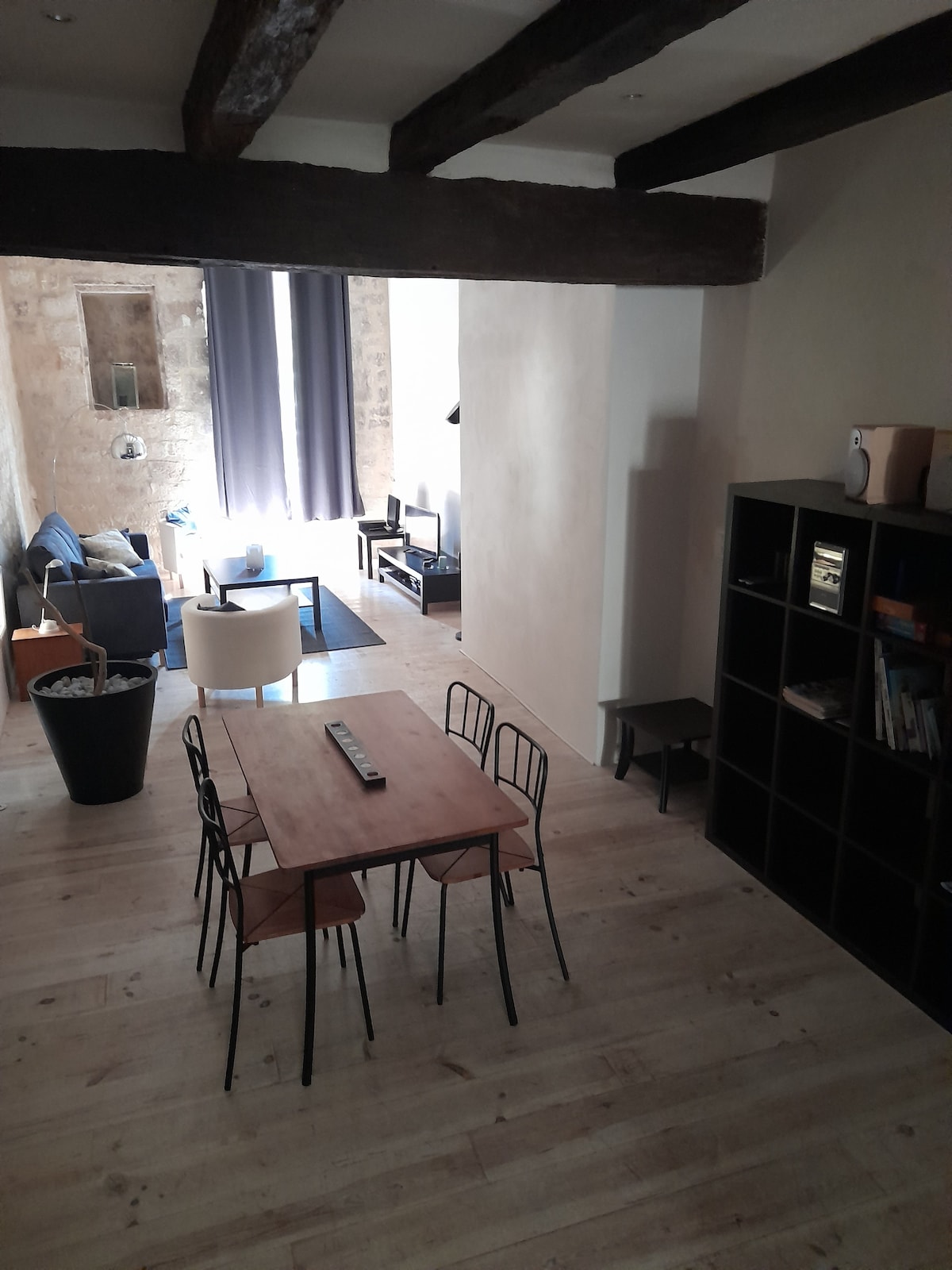 Appartement entièrement refait à neuf situé dans un quartier calme du centre ville de Sarlat avec parking public gratuit à 200m et commerces accessibles à pieds. Pour 2 personnes: Salon/séjour avec cuisine ouverte, coin repas, canapé et TV. A l'étage, salle d'eau avec douche et WC, Chambre avec grand lit (160) et rangements (penderies). Très lumineux et calme avec jolie vue sur les toits de la ville et les monuments emblématiques. Draps et linge fournis.
