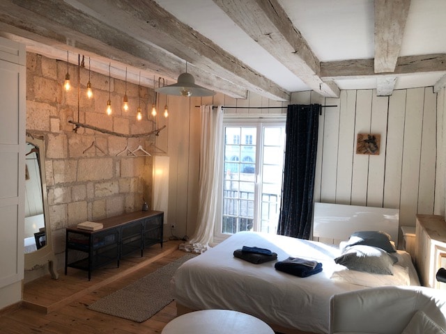 Au cœur du quartier Historique de la Cathédrale Saint Gatien et au sein d'une bâtisse en pierre de taille et colombage du 16 eme siècle, le RUDELABAR est un lieu de vie aux couleurs apaisantes : blanche et noire mêlées au naturel du bois. Baigné de lumière entrant par une large fenêtre qui surplombe les terrasses des belles demeures avoisinantes du quartier du palais des beaux arts. Avec Pour la douceur de votre séjour dans ce lieu calme, un grand lit de (160/200) au matelas très confortable