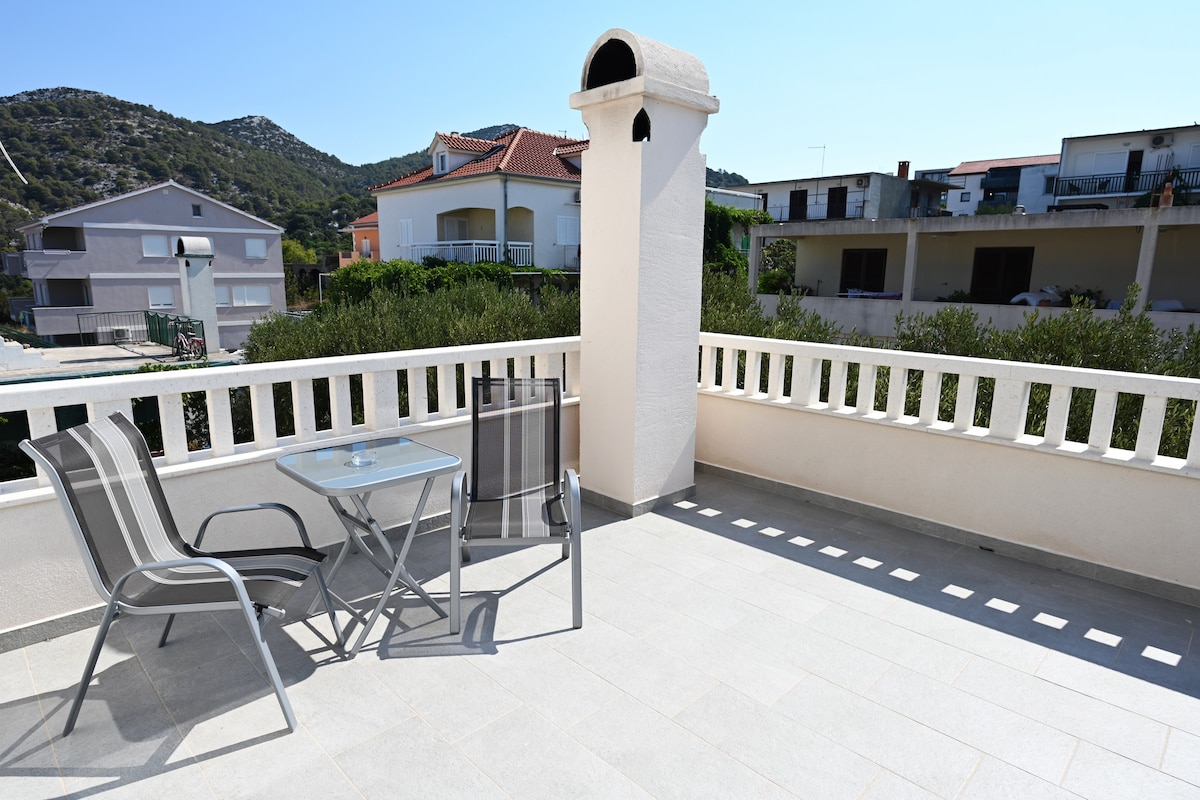 Lovely newly renovated, in 2025, apartment on the 1st floor of our family house, “Veli Bok,” with a great view of the sea and the Hvar archipelago. It's located in a quiet neighborhood, still close to the town center and far enough to enjoy tranquillity away from town buzz. Our house is located 20/25 minutes' walk from the harbour/main square, which is 1,5 km/2 km away.