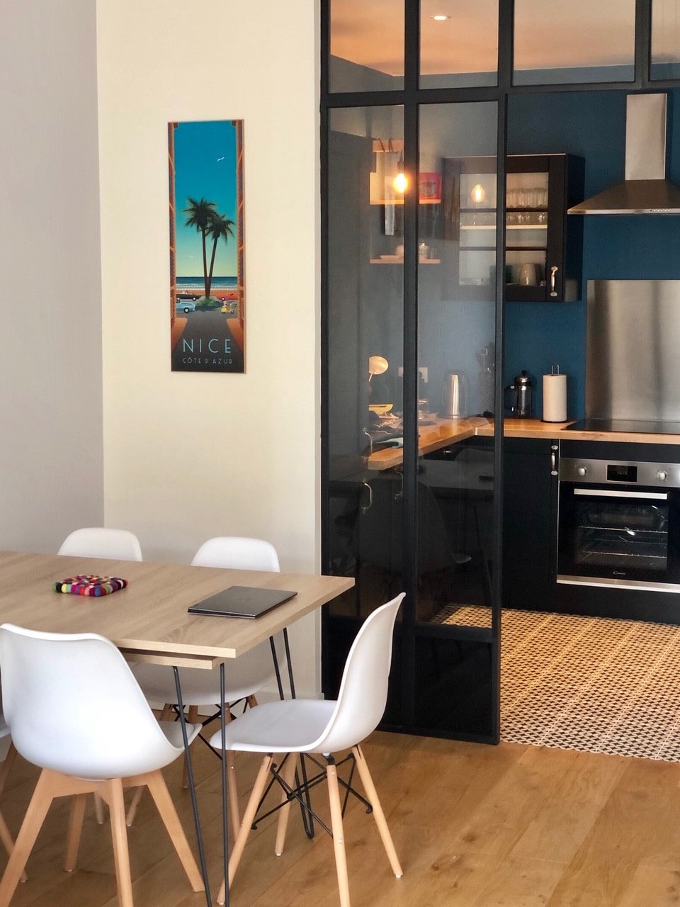 エレベーターのない最上階にあるアパートからは、旧市街の教会の屋根と鐘楼がとてもよく見えます。 徒歩わずか5分でビーチに到着します。 絵画のように美しく活気に満ちた旧ニースの中心部にありますが、アパートは賑やかな通りにあります。 その他の注意点として、アパートは5階と最上階にあり、階段の最後の部分は少し狭いです。 階段は怖いかもしれませんが、アパートは少し努力する価値があります。