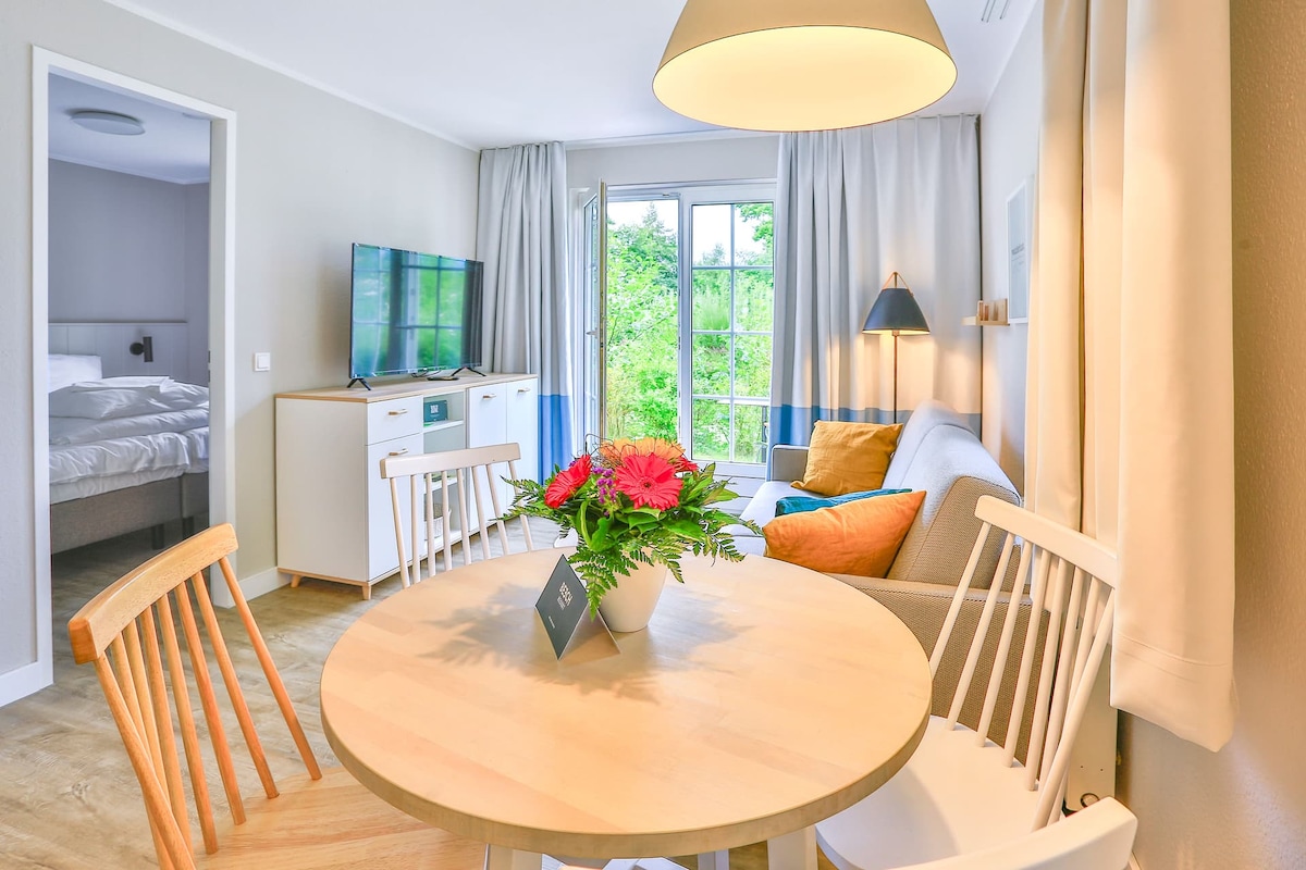 Each apartment is fully equipped with a kitchen, elegant furnishings, and either a balcony. The kitchen is equipped with everything you may need and the bathroom and bedroom are very modern and comfortable. Should you want to explore the region, we offer bikes or you can stay at the resort and enjoy the Sauna, lake or heated pool.