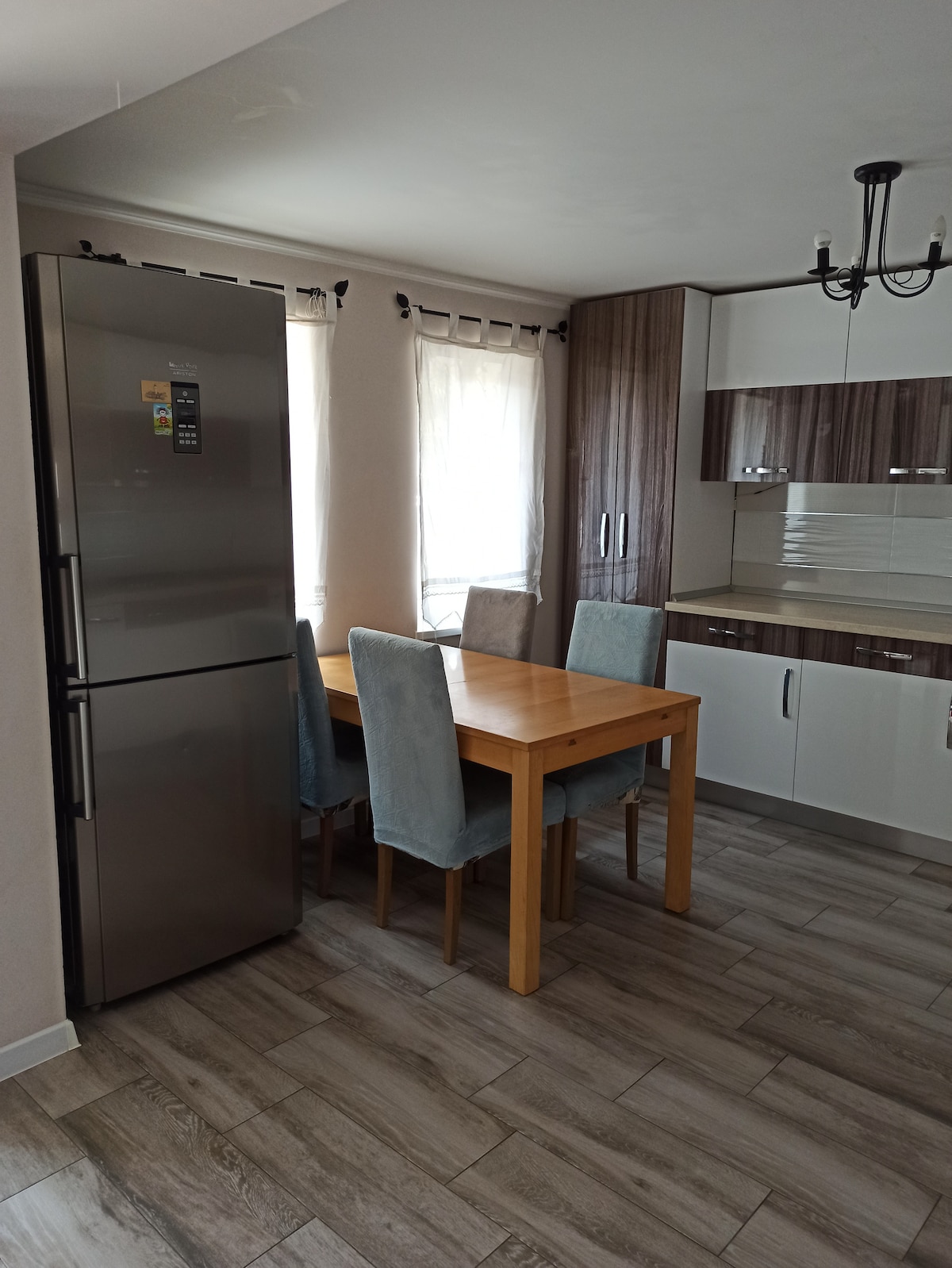 キッチン、オープンスペースタイプ、寝室、バスルーム、廊下、寛大なテラスなど、インテリジェントに仕切られた2部屋のアパート。 アパートには独自の暖房ユニットがあり、床暖房、エアコン、シャワー付きバスルーム、スマートテレビ、Wi - Fiがあります。 専用キッチン(オープンスペース)は設備が整っており(ガスコンロ、電気オーブン、冷蔵庫、乾燥機付き洗濯機)、リラックスできるダイニングスペースが完備されています。 リビングには固定ソファが備わっています。 バスルームにはシャワーがあります。