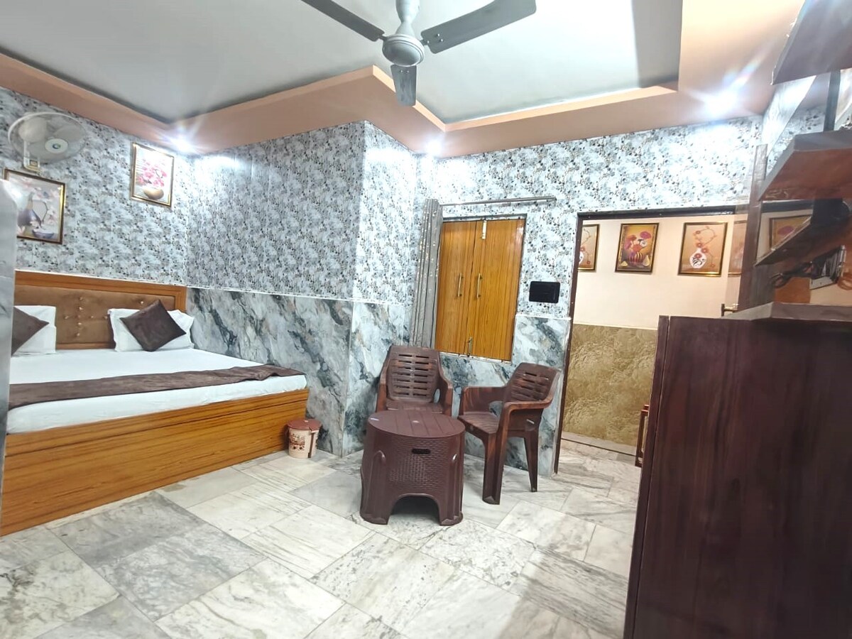 Stay at Bhakti Vanam, just 1.5 kms from the sacred Prem Mandir in Vrindavan. Enjoy a spacious studio with air conditioning, high-speed Wi-Fi, a private entrance, and a cozy balcony. Perfect for two guests, with an extra bed available if needed. Convenient to temples and public transport, and scooty rentals can be arranged. Full access to a well-equipped kitchen and clean washroom. Ideal for families or solo travelers seeking comfort and peace in a spiritual place.