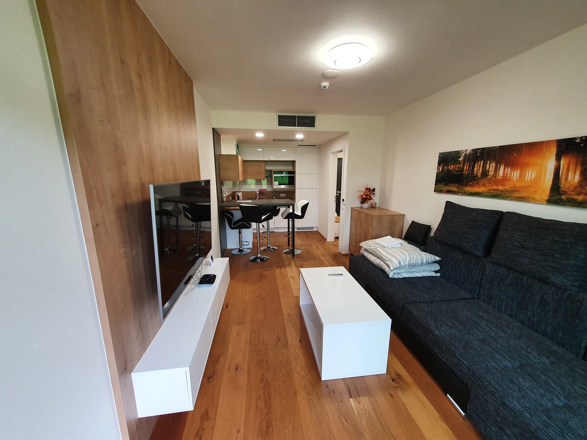 Apartmán typu Superior s ložnicí, obývacím pokojem a plně vybaveným kuchyňským koutem. Kuchyňský kout je vybaven lednicí, mikrovlnou troubou, varnou deskou, rychlovarnou konvicí, myčkou a kávovarem Nespresso. V obývacím pokoji je sedací souprava, ze které lze připravit velmi pohodlné spaní pro dvě osoby. Koupelna s vanou a WC. Na apartmánu je balkon, který vybízí k příjemnému posezení s výhledem do přírody.