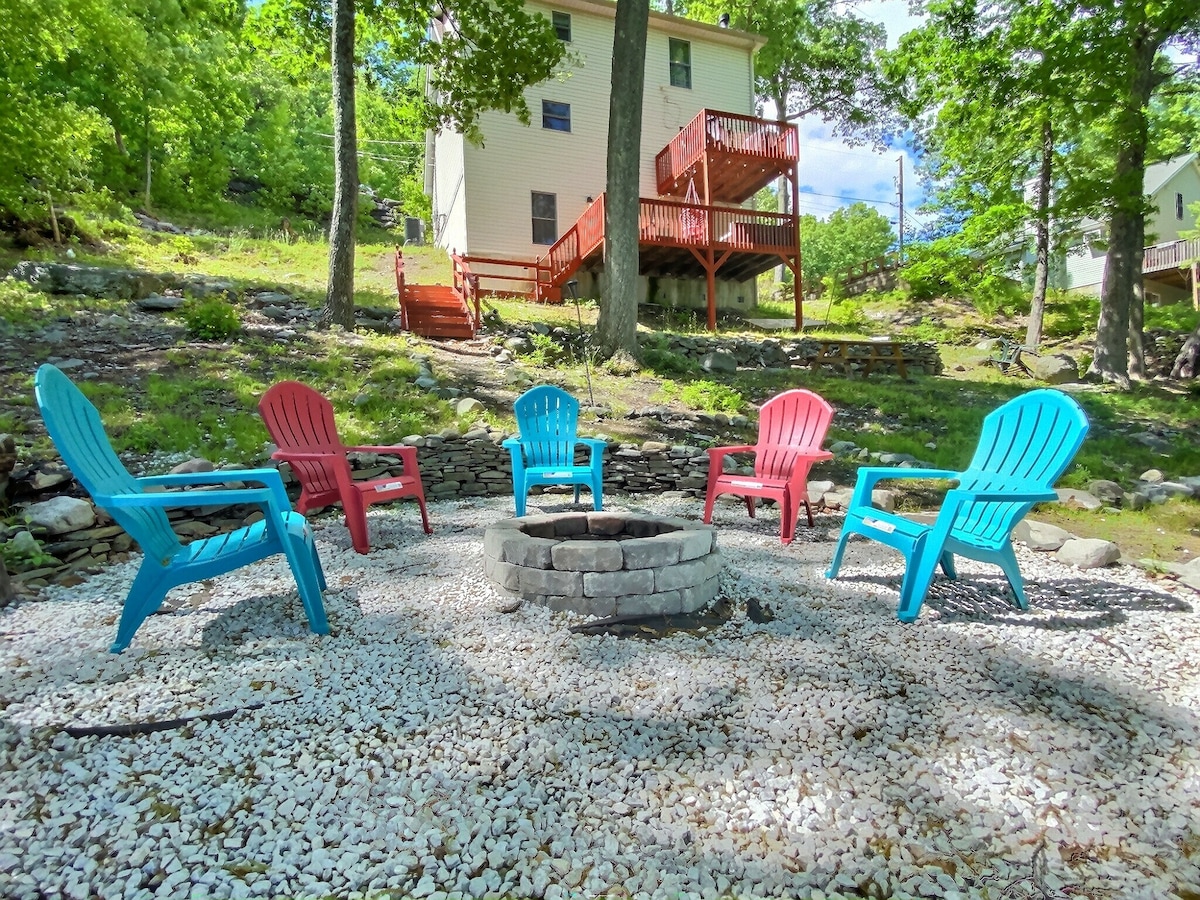 ペットのポリシー、薪などについては、下部の「詳細を表示」を選択して、よくある質問をご覧ください。 ポコノ山脈にある森の中の幻想的な住居に滞在しましょう。各寝室は季節にインスパイアされています。 木々に囲まれたテラス、木々に囲まれたピクニックテーブル、燻製器/グリルをお楽しみください。 洗濯機・乾燥機、フルキッチン、フルバスルーム2室を完備しています。 ブッシュキル滝(10分)、ショーニーマウンテン(15分)、デラウェアウォーターギャップ(20分)の近くにあります。 ゲート付きのコミュニティにある宿泊先で、ゲスト用アメニティがたくさんあります。