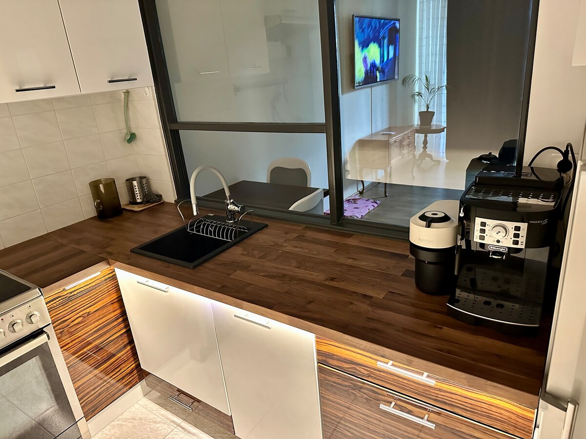 良質なリネン、タオル、化粧品を備えた、とても快適なベッドを備えた美しく、新しくて清潔なワンルーム。 新しい家電を備えた設備の整ったキッチン。 ケトル、滞在中にさまざまなフレーバーを備えたコーヒーメーカー、ミルクフローザー、基本的な朝食用品。 1台分の無料駐車場! ! ! 国際テレビとNetflixを備えた大型テレビ! ワンルームマンションは、24時間365日警備の新しく清潔で安全なエリアにあります。清潔、静か、静か!