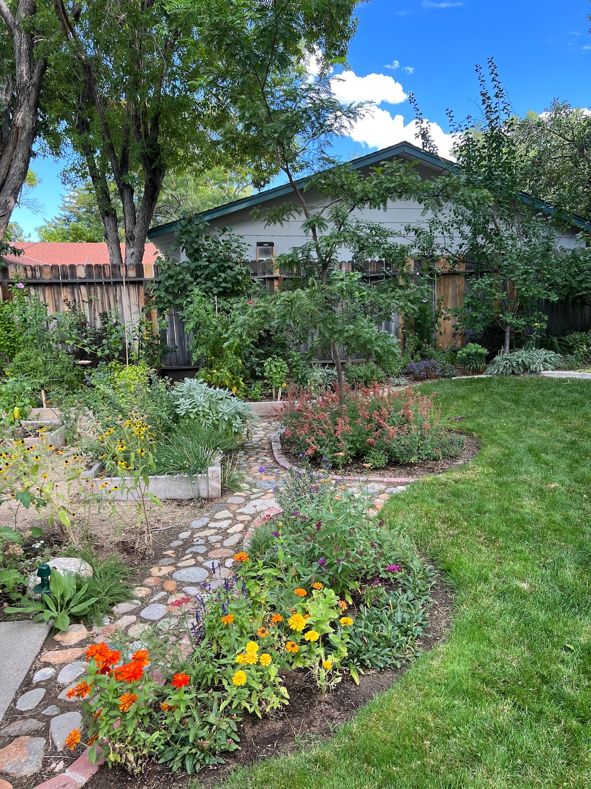 この家はリノのオールドサウスウェスト(ニューランズ)地区の中心部にあり、カリフォルニアストリート、空港、ネバダアートミュージアム、トラッキー川、ナイトライフに近いです。 とても歩きやすく、フレンドリーな「オリジナルリノ」の近隣にある、並木道の楽しい通り。 ダイニングルームからのデッキ-日当たりの良い南側、 .....個性的な家具 そして ..400 MBのWi-Fiインターネットダウンロード速度! インターネットサービスは常にオンになっており、ゲストがオフにすることはできません。