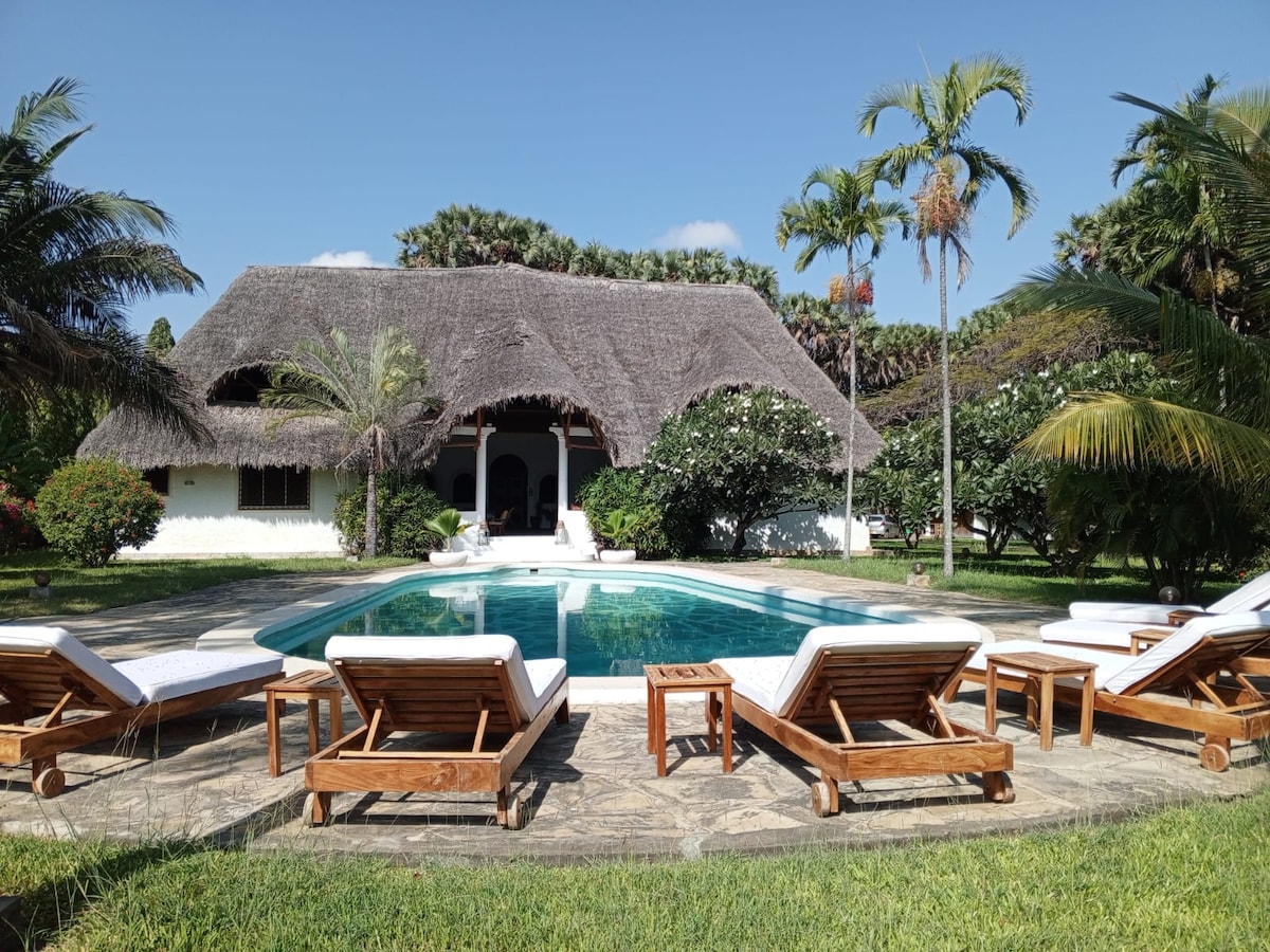 This lovely 4-bedroom villa is beautifully set over three spacious floors, all arranged around a charming three-sided courtyard, which overlooks a large inviting swimming pool that is perfect for cooling off its located just a short 3-minute stroll away from the stunning Watamu Marine Park, accessible via the public beach access road. Additionally, it is only about a ten-minute walk from the picturesque Mida Short Beach With a fabulous mature forest tree towering the courtyard