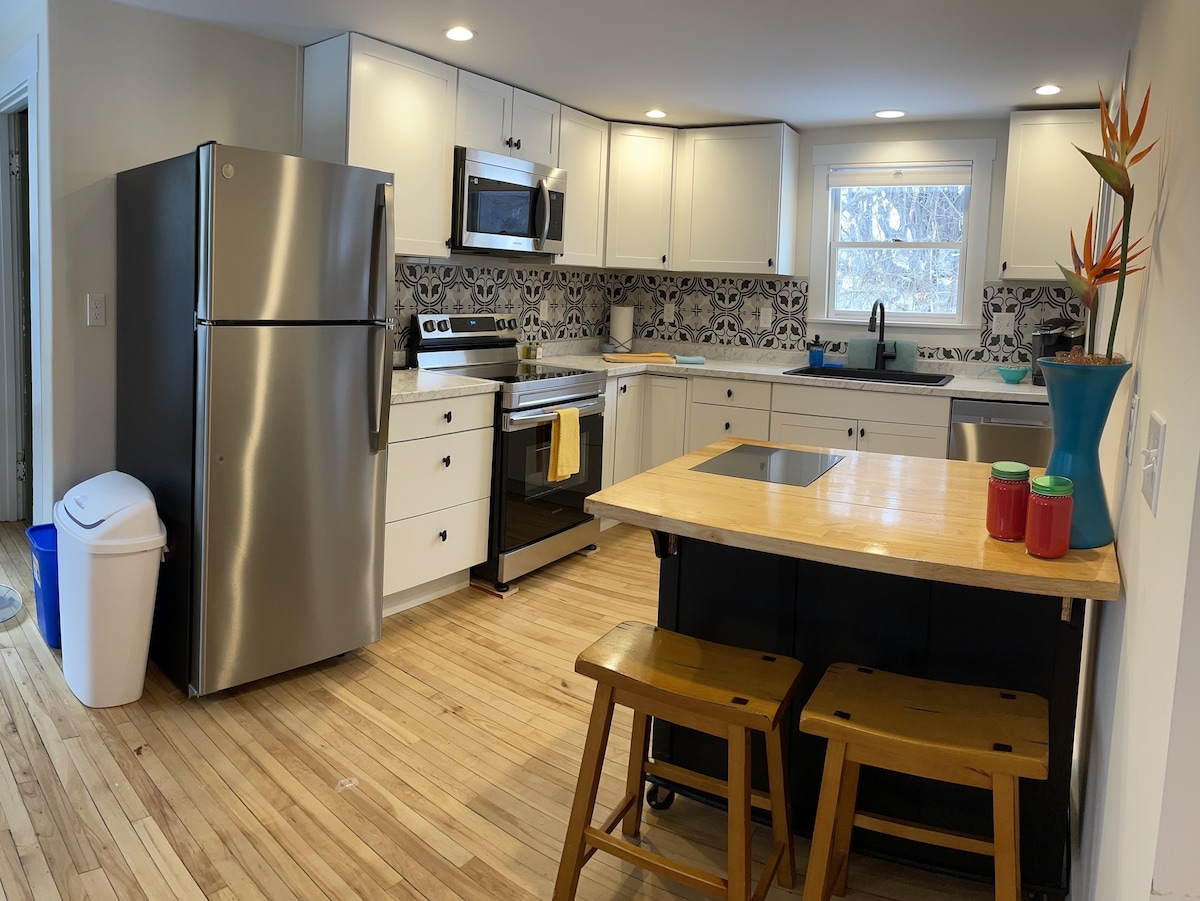 ゲストルームには、夏用の小さなテーブルと椅子が備わった、屋根付きの裏ポーチの外にある専用玄関があります。壁掛けのエアソース、ヒートポンプから調節可能な暖かい空気と冷たい空気が出ます。 小さなキッチンのアルコーブは、コーヒーや紅茶、軽食に便利です(オーブントースター、シングルインダクション「ホット」プレート、給湯器) 私たちは歴史的な建物に住んでいます。私たちの近所はルート100にとても近いです。ウォーターベリー村とストウも近くにあり、スキー、ハイキング、サイクリングも楽しめます。