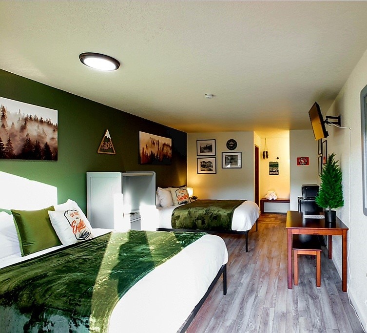 快適なダブルクイーンルームから人気のお店やレストランまで歩いて行けます。ワシントン州レバノースを訪れるご家族連れ、ご友人、小さなグループに最適です。この広々とした客室には、クイーンサイズベッド2台と新しく改装された専用バスルームが備わっており、リラックスした滞在に必要なモダンなアメニティがすべて揃っています。 各客室には、50インチ薄型テレビ、ミニ冷蔵庫、電子レンジ、コーヒーメーカー、ヘアドライヤー、無料Wi-Fiが備わっており、すべてのゲストに快適さと利便性をお約束します。