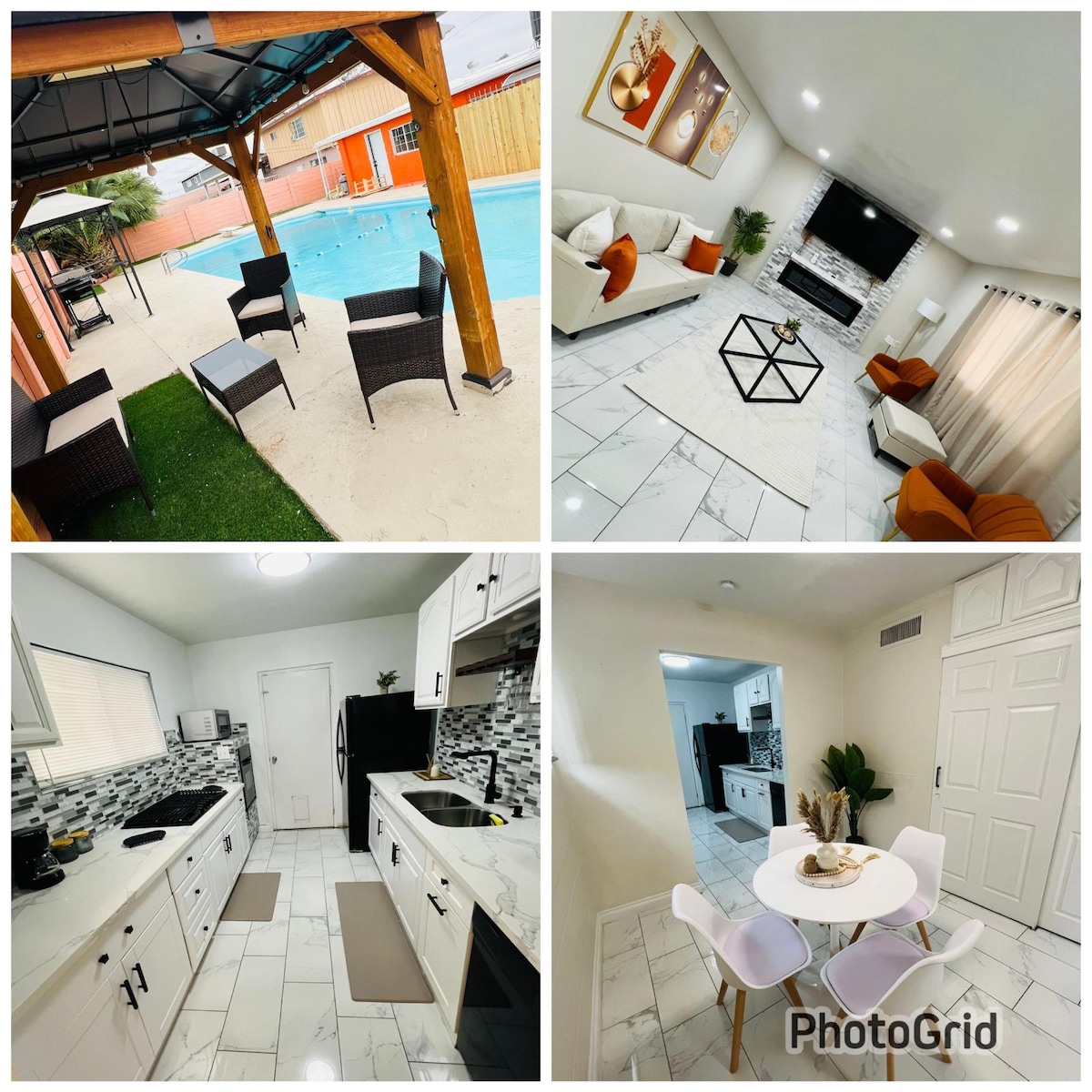 美しく広々とした4ベッドルーム/3バスルーム、ベッド5台/ビーンバッグはダブルマットレスに変わります。 ストリップ/空港から3マイル未満の場所にある家です。 専用バスルーム付きマスタースイート。ファミリールームには86インチのテレビがあります。 あらゆるシーンに対応できる充実したキッチン。 全室に専用の仕事スペース。 ストリーミング、仕事、グループのビデオ通話に最大1 GBの高速インターネット。2台のアーケードゲームとポーカーテーブル。 専用の屋外プール。 屋外バーベキューもあります。袋小路に面しています。 家族連れやペット連れで泊まれます。