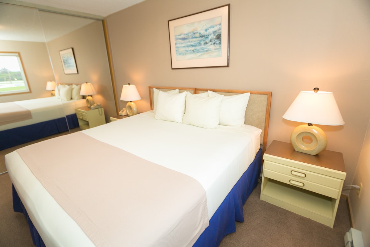 家族連れに人気!この素敵なエンドユニットには、フルキッチン、ダイニングエリア、ソファベッドを備えた居心地の良いリビングルームがあります。寝室にはクイーンベッド2台とテレビがあり、裏のデッキに直接アクセスできます。専用デッキから夕日を眺めたり、鹿が歩き回る芝生に出かけたりしてお楽しみください。ピクニックエリアや屋外プールへのアクセスも簡単で、ビーチサイドでの楽しみに最適です。もっと広いスペースが必要ですか?隣接するスタジオスイートを予約しましょう。ドアで繋がっています。
