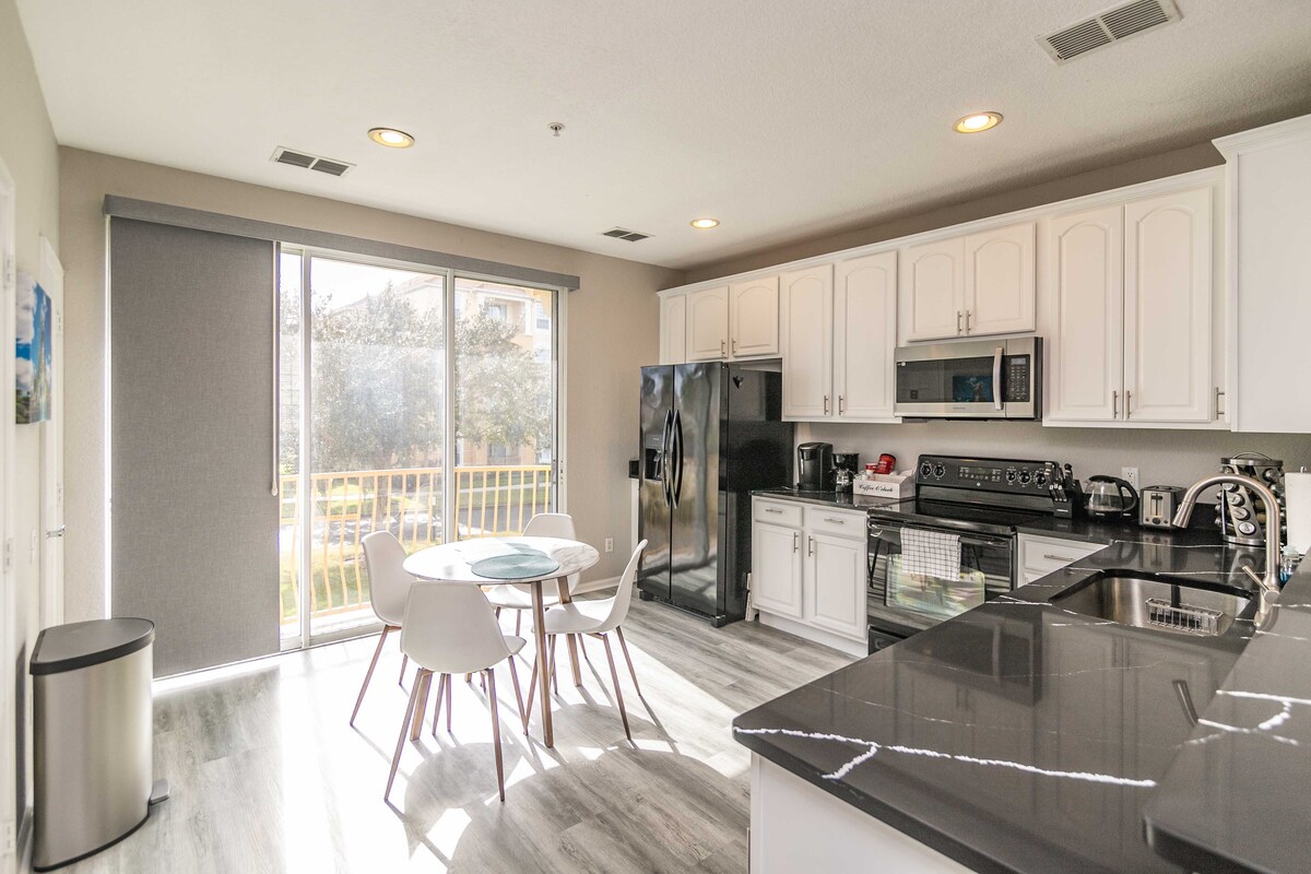 Beautiful updated 3bedroom 2 full bathrooms, sleeps 8; only 200 ft from club house. Located near Universal Studios, Sea World and within walking distance to Orange County convention center and International Drive. For your convenience we offer valet wagon for those heavy bags and electronic door lock for easy access. Our club house has a large hot tub, 2 pools ( 1 large adult and 1 large children's pool ), pools are heated during winter, poolside tiki bar, fitness room, gated community .