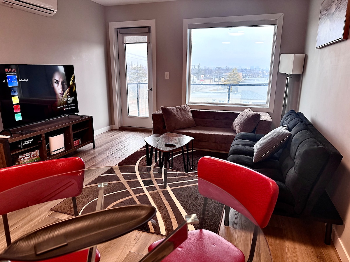 天井高9フィート、特大窓、石英カウンター、ステンレス製家電、スイート内の洗濯機/乾燥機、シティビューのプライベートバルコニーを備えた、豪華な2ベッドルーム/2バスルームのアパートでスタイリッシュに滞在しましょう。スマートなレイアウト、クイーンベッド、4人用のダイニング、備品が揃ったキッチンで広々とした生活をお楽しみください。交通機関、ショップ、レストラン、電気自動車充電ステーションからすぐ近くです。エレベーター、屋上パティオ、セキュリティで車椅子でアクセス可能。ご家族連れ、ビジネス、またはおひとり様のご滞在に最適です。