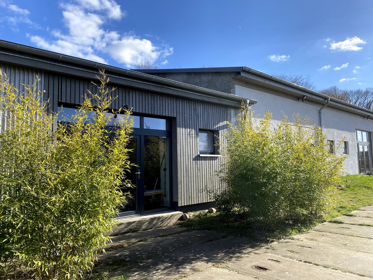 ...ベッドから水を眺め、平和と静けさを楽しみ、ブナの森のささやきに耳を傾け、水上で直接自転車ツアーを体験し、自然を楽しみましょう。 茅葺き屋根、モロッコタイル、オーク材のフローリング、粘土石膏の壁を備えた、美しくモダンで素朴な低エネルギー半木造の家があなたを待っています。 アクティビティには、森のブランコ、無料のスチームサウナ、屋外シャワーとバスタブ、スタンドアップパドル、パドルボート、4台の自転車を備えた美しい大きな庭があります。