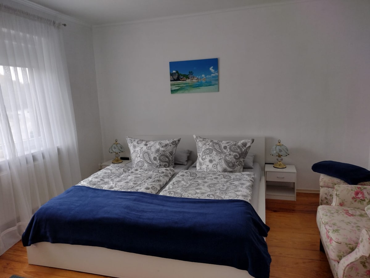 専用玄関、ミニキッチン、洗濯機付きシャワーバスルームを備えた一戸建て住宅内の小さなアパートメントを提供しています。アパートには、庭用家具を備えた専用テラスがあります。ご要望に応じて、無料で自転車をご利用いただけます。Wi-Fiとテレビが利用可能で、家の前に駐車場があり、静かな住宅地にあります。 場所:A7まで5分、ハンブルク空港まで32 km、ホルステンサーマAKN駅まで徒歩15分(ハンブルクへの鉄道接続)、冒険プールと屋外プールまで徒歩15分