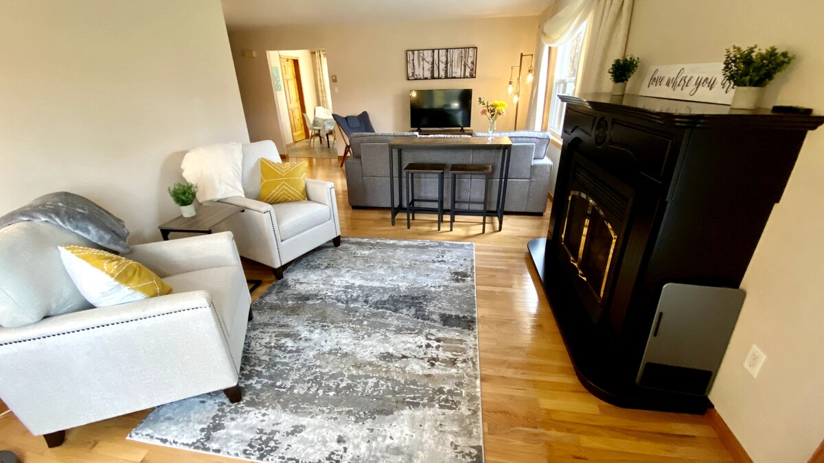 こちらのおしゃれなお部屋で、のんびりとおくつろぎください。この場所にある2つの短期宿泊施設のうちの1つです。 キッチンにはコーヒーバー、ファームハウスシンク、パントリーがあります。 リビングルームのシップラップの壁には55インチのテレビと電気暖炉があります。引き出し式ソファもあります。 2ベッドルーム、11/2バスルーム、このユニットは4人用です 屋外スペースは娯楽のために建てられており、大きなデッキは部分的にカバーされているので、雨の日でも楽しむことができます。プロパンと薪の火鉢。レストラン、バー、マーケット、ショップまで徒歩で行けます。 ペットOK