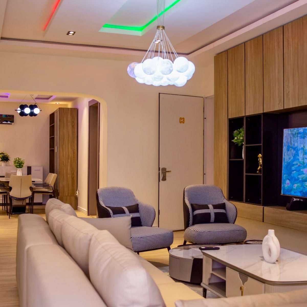 Door with Code Private Balconies Washing Machine Cozy 3 Bedrooms 5 Air-Conditioners Dedicated Workspace Furnished Living Room Fully Equipped Kitchen 4 Toilets and 3 Bathroom Starlink & Fibre Optic Wi-Fi 24/7 Light (Solar | Inverter | Gen) If No Power Grid: Gen: 6am-8am,6pm-12am but inverter always on. Proximity to Markets, Night Clubs, Restaurants and Stores Clean and Fresh Bedding and Towels Serene, Secure, and Beautiful Neighborhood 85”, 65", 50", 50" Smart TV (Prime, Netflix)