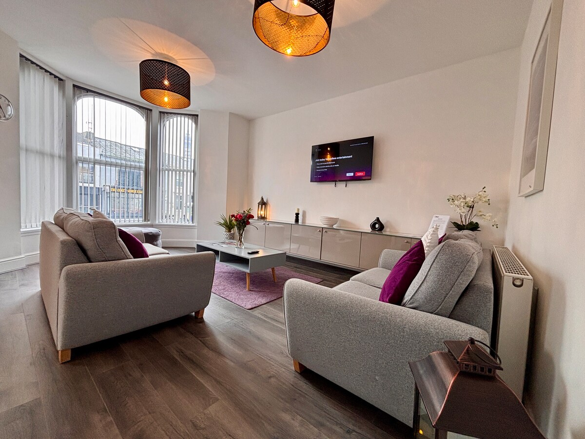 象徴的なブラックプールタワー、美しい海辺、ウィンターガーデン、そしてすべての主要なアトラクションから徒歩わずか5分の場所にある、スタイリッシュで広々とした4ベッドルームのアパートをお楽しみください。 ブラックプールの中心部に位置し、エンターテイメントやダイニングからショッピング、家族向けのアクティビティまで、あらゆるものに近いので、滞在の拠点として理想的です。 中心部に滞在しましょう。快適に滞在しましょう。ブラックプールの魅力をすぐ近くで体験しましょう。