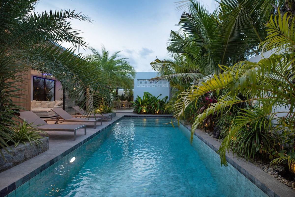 👫 AlanとNuchがあなたを私たちの家に招待します。大きなプライベートスイミングプールを囲む緑豊かな熱帯庭園に囲まれた静かなヴィラです。 🏡当宿泊施設は、伝統的なタイスタイルで上品に装飾されており、豪華なアメニティが備わっており、快適に過ごせます。敷地内には私たち以外のゲストはいません。 📌当宿泊施設の立地は安全で静かですが、ビーチ、レストラン、バー、ショップ、アトラクションなどに近く便利です。 ⚠️ 重要な詳細については、すべてのセクションをお読みください!!