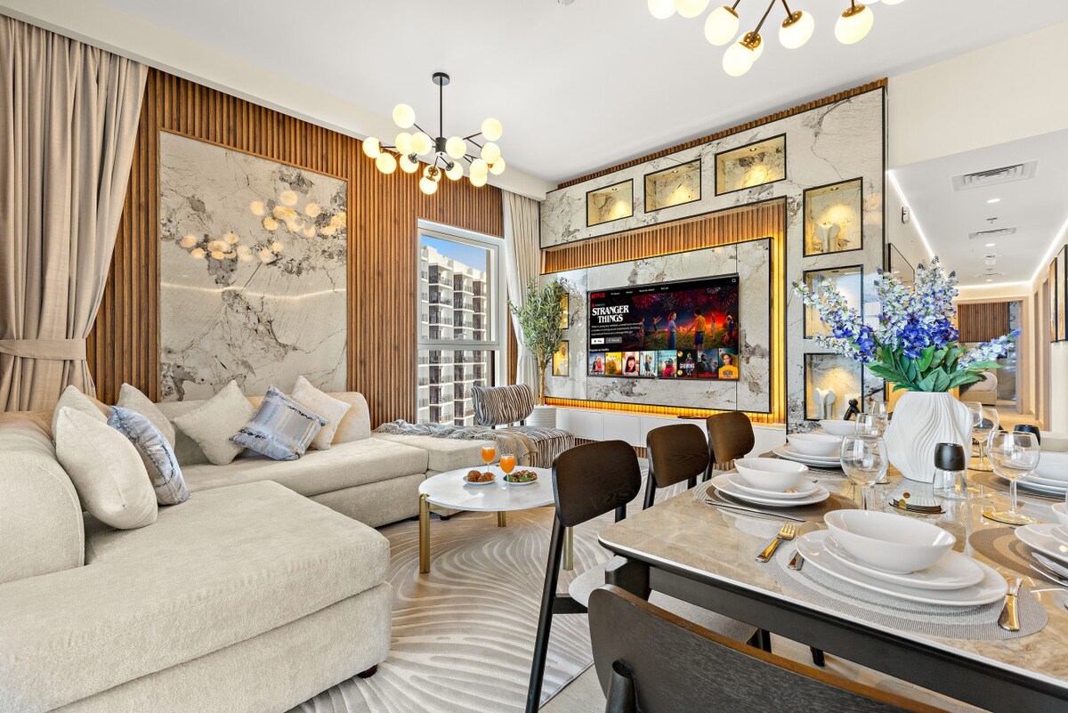 Relax in this elegant studio in Yas Golf Collection, steps from Yas Links Golf Course and close to the Formula 1 circuit. Unlike standard furnished units in the building, this residence has been upgraded with premium décor and higher-end furnishings for a boutique-hotel feel. The studio includes a plush king bed, full kitchen and smart TV.