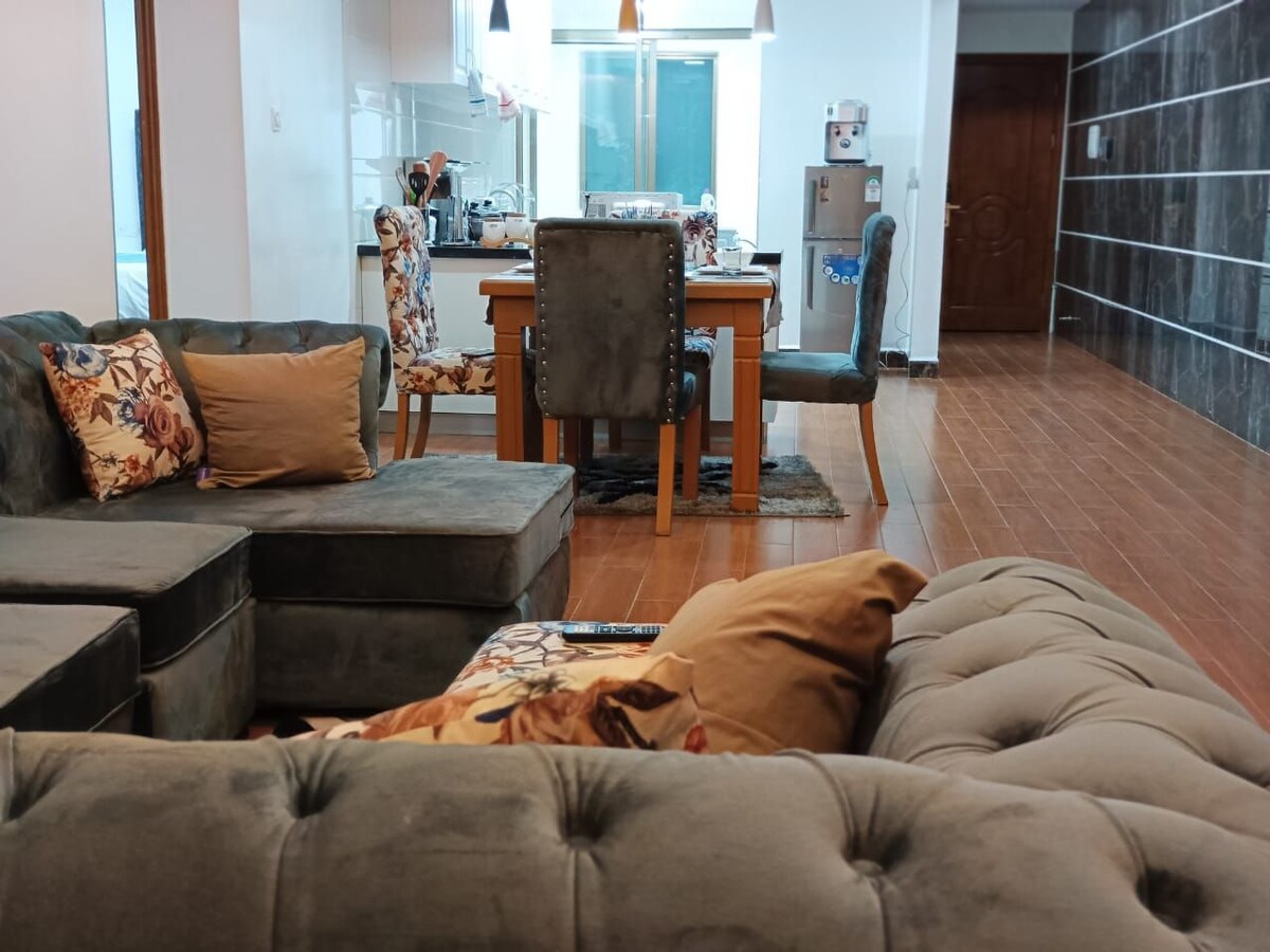 こちらのユニークで静かな1ベッドの宿泊先で、ごゆっくりおくつろぎください。新しい1ベッドルームのアパートで、クイーンベッドを備えた清潔なアパートです。素晴らしい温水シャワー、快適でモダンなソファ、高速インターネットが備わっています。設備の整ったキッチン、ミニマリズムのコンセプト、素晴らしい街の景色が見られます。 フルバックアップ発電機、温水プール、最先端のジム、子供用プレイエリアがあります。 ロケーションも最高で、交通機関も便利です。