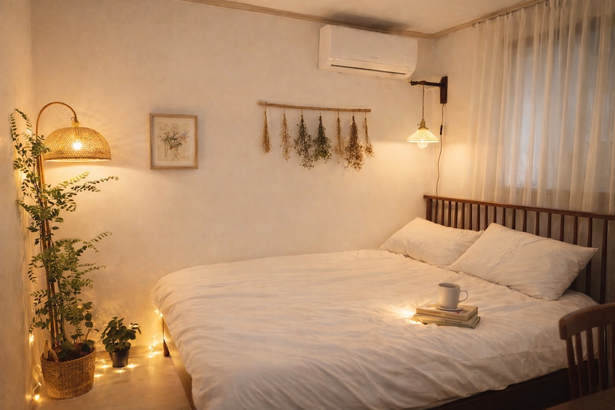 >弘大と漢江の間、川が暖かさと出会う場所 「RIVON STAY:MAPO」「City beat, Slowed pace」 「上水洞の穏やかな感性とヒップな感性を同時に抱き、写真に収まらない温かい雰囲気と細やかな配慮が感じられる、特別な旅を作りましょう。 -単に寝るだけの場所ではなく、好きな音楽を聴きながらワインを楽しむ*感覚的な生活*を体験してみてください。 -深いプラムカラーのマスタングLPプレーヤーとビームプロジェクターが用意されています。お気に入りの音楽や映画でプライベートな夜をお楽しみください -寝室(クイーンベッド2台、シングル1台 - 最大5名)とリビングルーム(ダイニングルーム)が完全に分離されているため、快適な休息が可能です。 -フラットなクイーンサイズの「バンカーベッド」-1階は広いクイーンサイズ、2階はシングルサイズに設計されており、バンカーベッドならではの居心地の良さを残しつつ、フラット感を完全に排除しました。 •場所:上水駅から徒歩3分。ホンデ、ハプチョンのホットスポットを歩いて移動しながらも、宿泊施設の周りは静かで、睡眠を保証します。